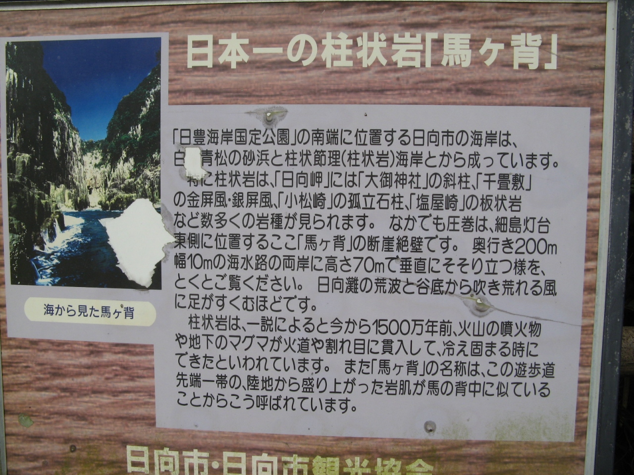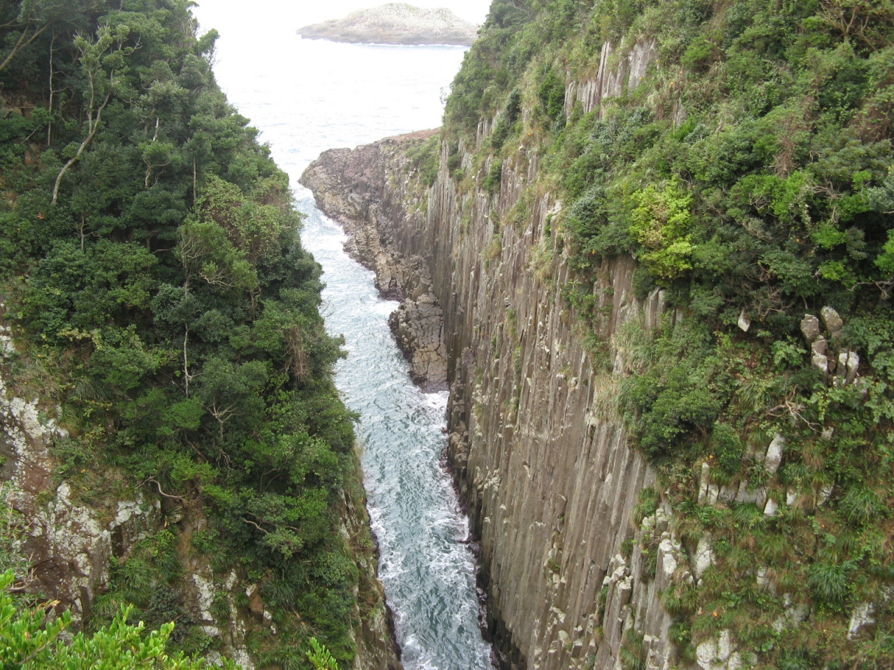 「馬ヶ背」は日向岬にある断崖絶壁です。奥行き200m、幅10mの海水路の両岸に高さ70mのそそり立つ柱状岩は見ごたえ十分です。