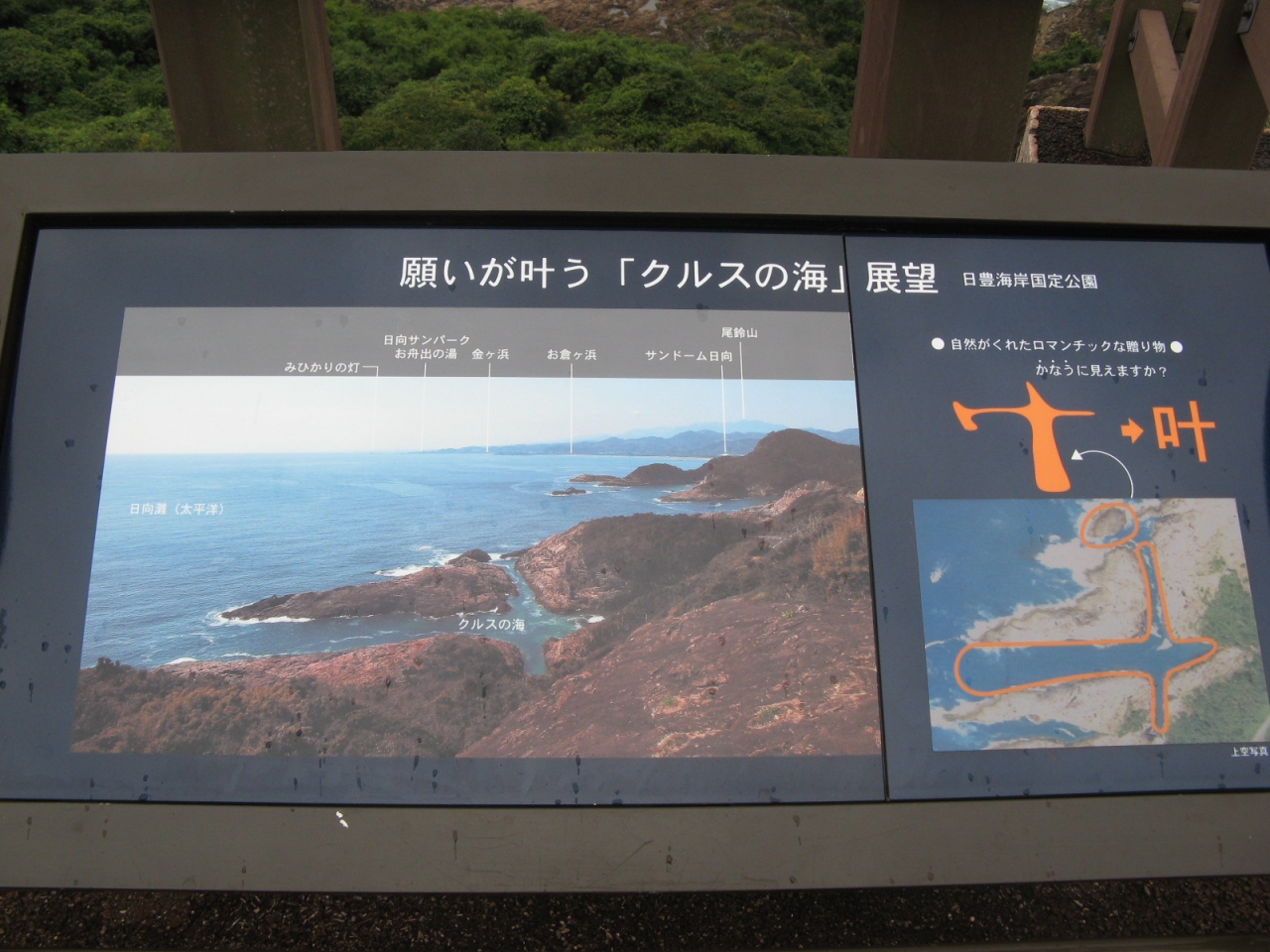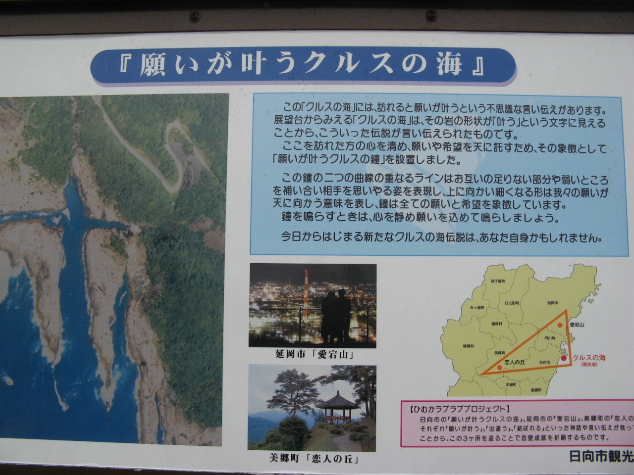 日向市街から東に車で10分あまり、日向岬に“願いが叶う”という事で有名な「クルスの海」があります。