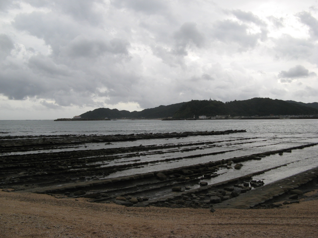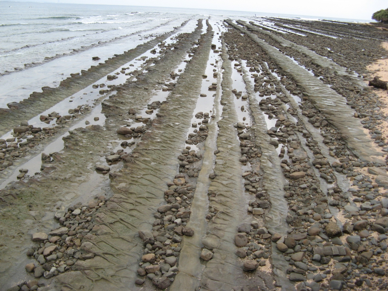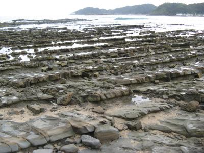 「鬼の洗濯板」は新第三紀(約1500~3000万年前)に海中で出来た水成岩(固い砂岩と軟らかい泥岩が繰り返し積み重なった地層)が隆起し、長い間に波に洗われ、固い砂岩層だけが板のように積み重なって見えるようになったものです。