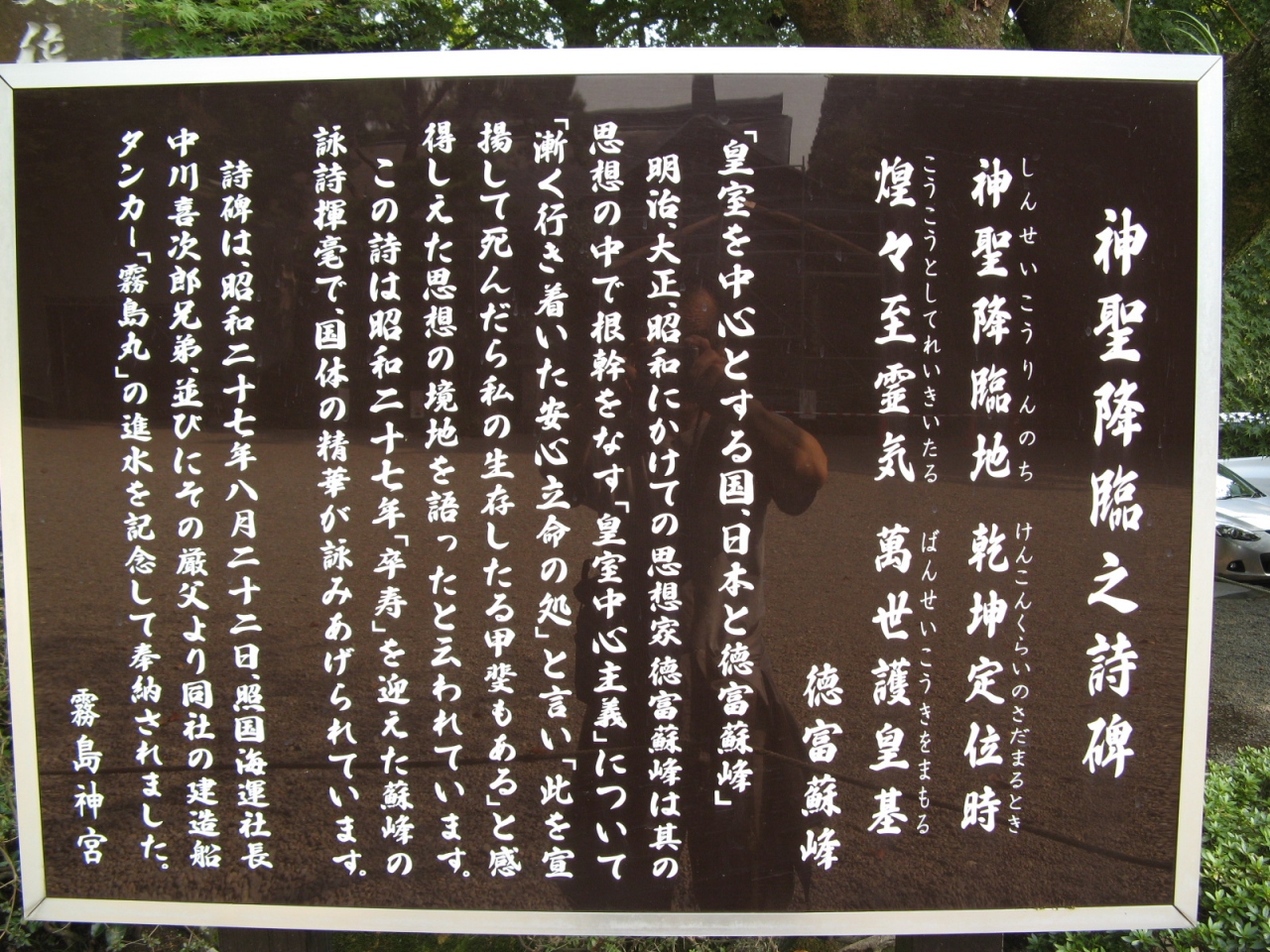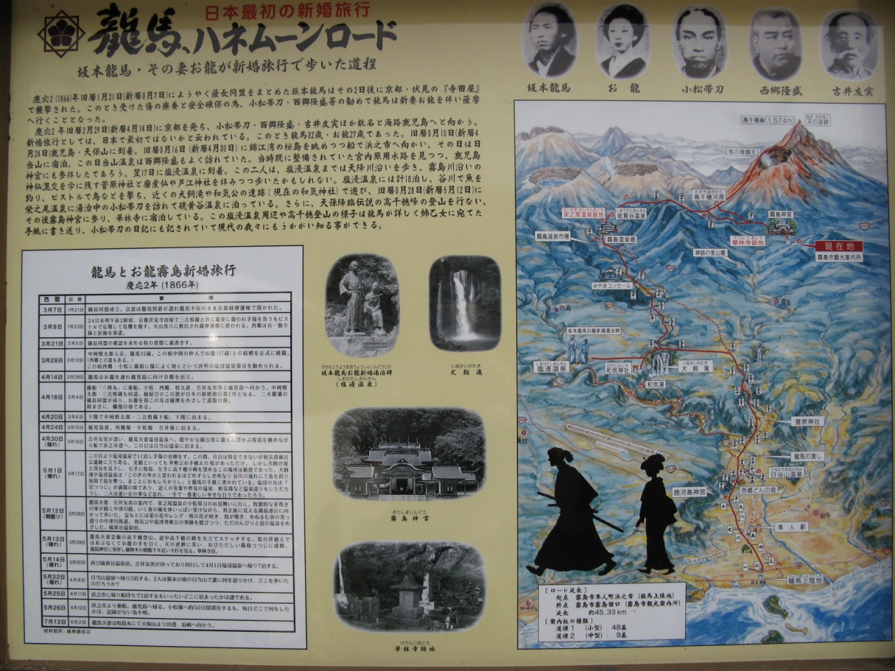 うっそうとした木々に囲まれた三の鳥居からしばらく歩いて行くと、本殿が見えてきます。本殿は朱塗りの大変華麗なもので、さすが“西の日光”と言われるだけありました。ここは、坂本竜馬とおりょうが新婚旅行で訪れたと言われる場所で、“竜馬ハネムーンロード”の説明板が建っていました。