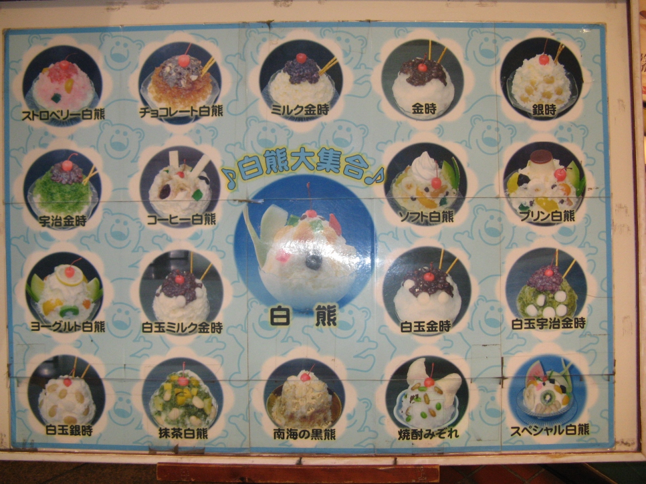 天文館にあり、店頭に大きな白熊と氷白熊が出迎えてくれるので判りやすいです。定番の白熊レギラーサイズのものを頂きましたが、おなかが冷えそうなほどのボリュームで、チェリー、レーズン、プラム、みかん、もも、バナナ、パイナップルなどがトッピングされており満足する美味しさでした。