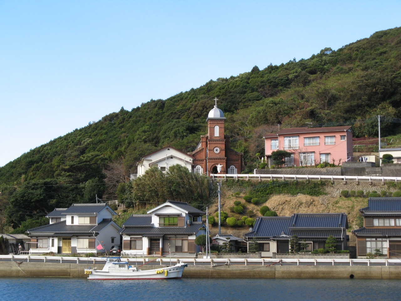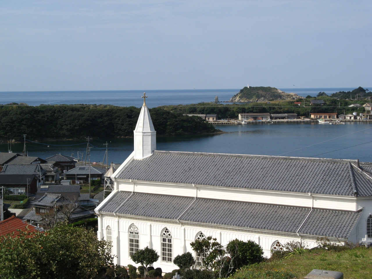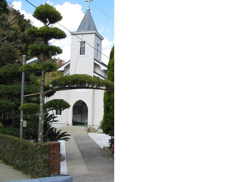 八角錐の屋根と塔をもつ小さな木造教会は集落のシンボルとして美しい奈摩湾を見下ろしていました。