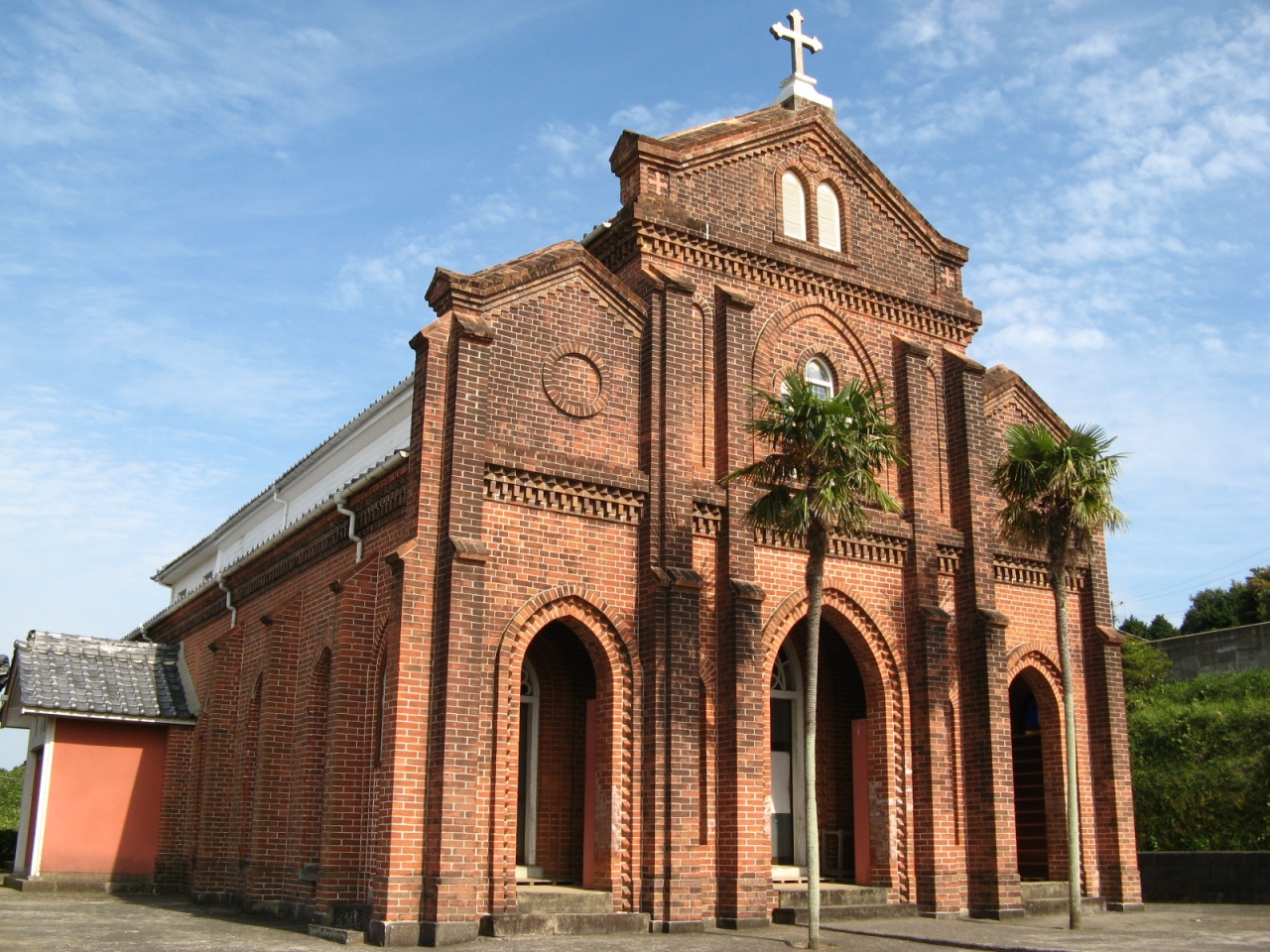 有川港から車で約15分、国指定重要文化財の「青砂ヶ浦天主堂」は、小高い場所から奈摩湾を見下ろすように正面を西に向けて建っています。青砂ヶ浦教会は、明治11年(1878年)に同地区のキリシタンたちにより聖堂がつくられ、その後、一度改築を経て、明治43年(1910年)に3代目となる現在の煉瓦造り教会が教会建築の名工・鉄川与助により建築されました。