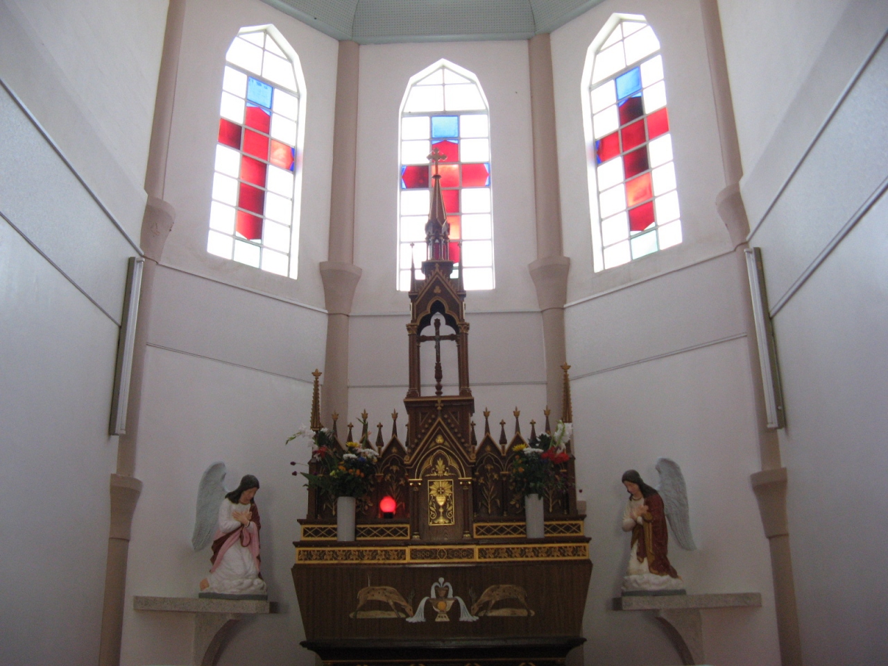 福江港、福江空港からいずれも車で約60分、「井持浦教会」は、福江島の西部に位置する教会です。この教会、初代は明治30年(1897年)に建立され、当時は、五島で最初の煉瓦造り教会でしたが、その後、拡張・改築を経て、現在はレンガ風タイル張りの鉄筋コンクリート造りの大きな教会となっています。