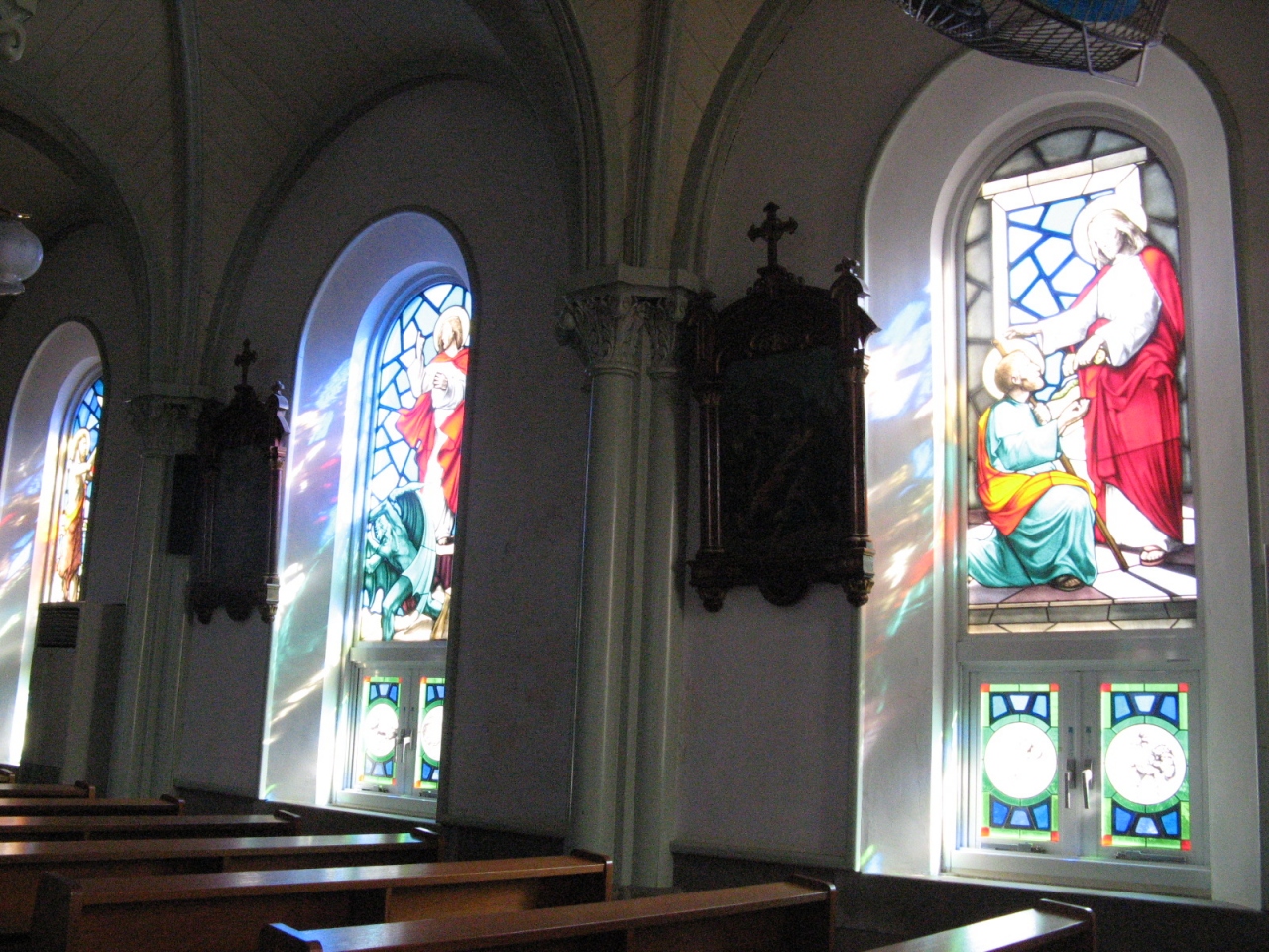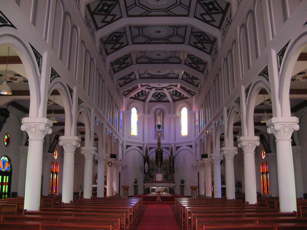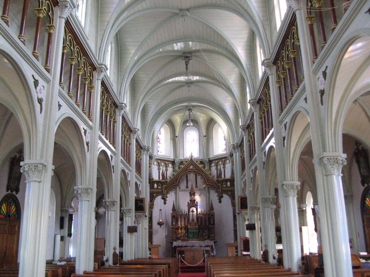 内部は高いアーチのこうもり天井で、周りには沢山のステンドグラスが飾られていて華やかで、神聖な雰囲気が漂う空間に感動しました。