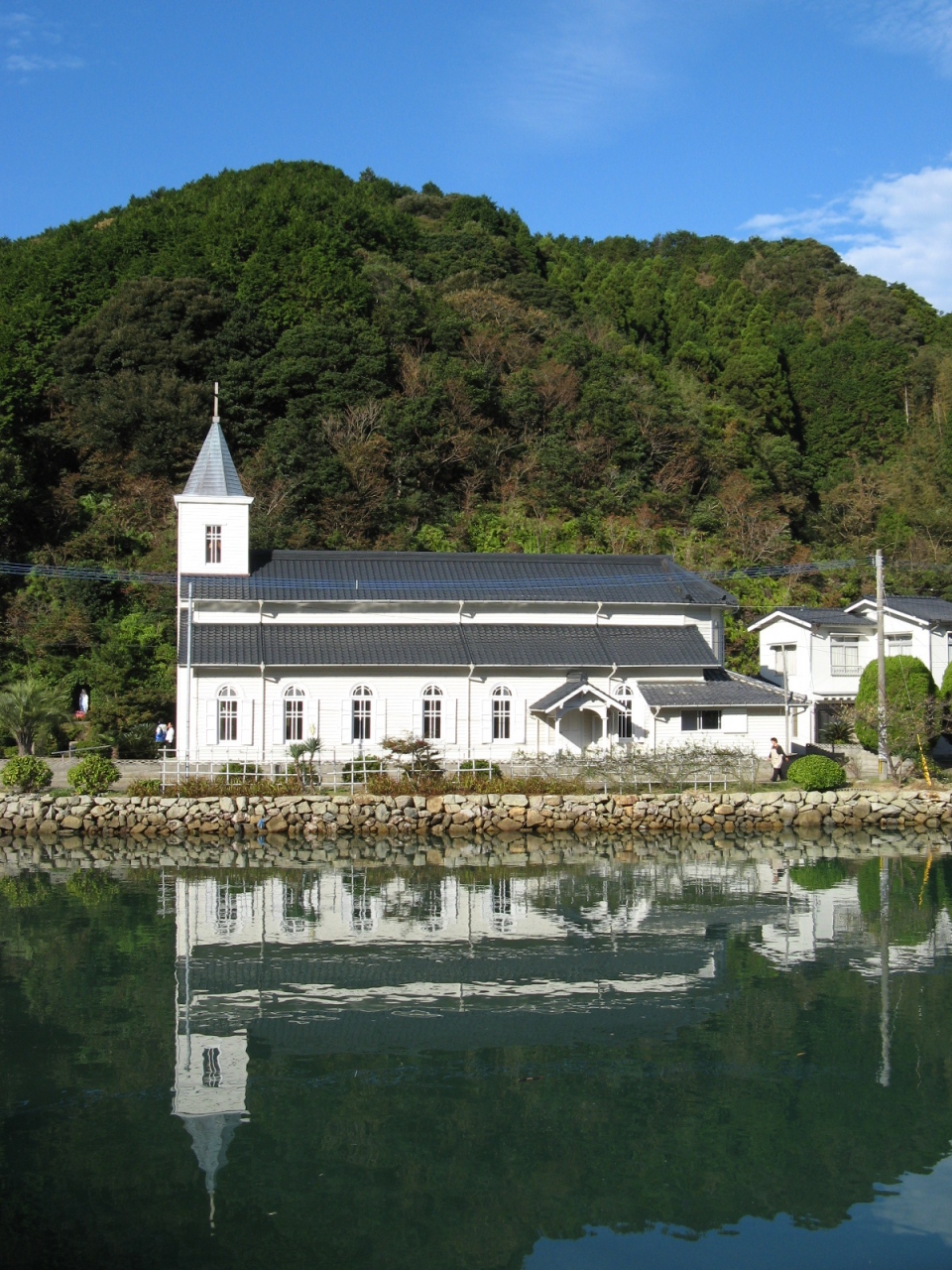 有川港から車で約20分、奈摩湾を見下ろす小高い場所に「冷水教会」はあります。明治40年(1907年)に教会建築の名工・鉄川与助により建築された木造の教会です。海のすぐ傍にあるため、海が時化たときなど影響を受けやすいと思いますが、周囲は塵ひとつ無く、教会も綺麗に維持管理されており地域の信者の方々に支えられていることが良く判りました。