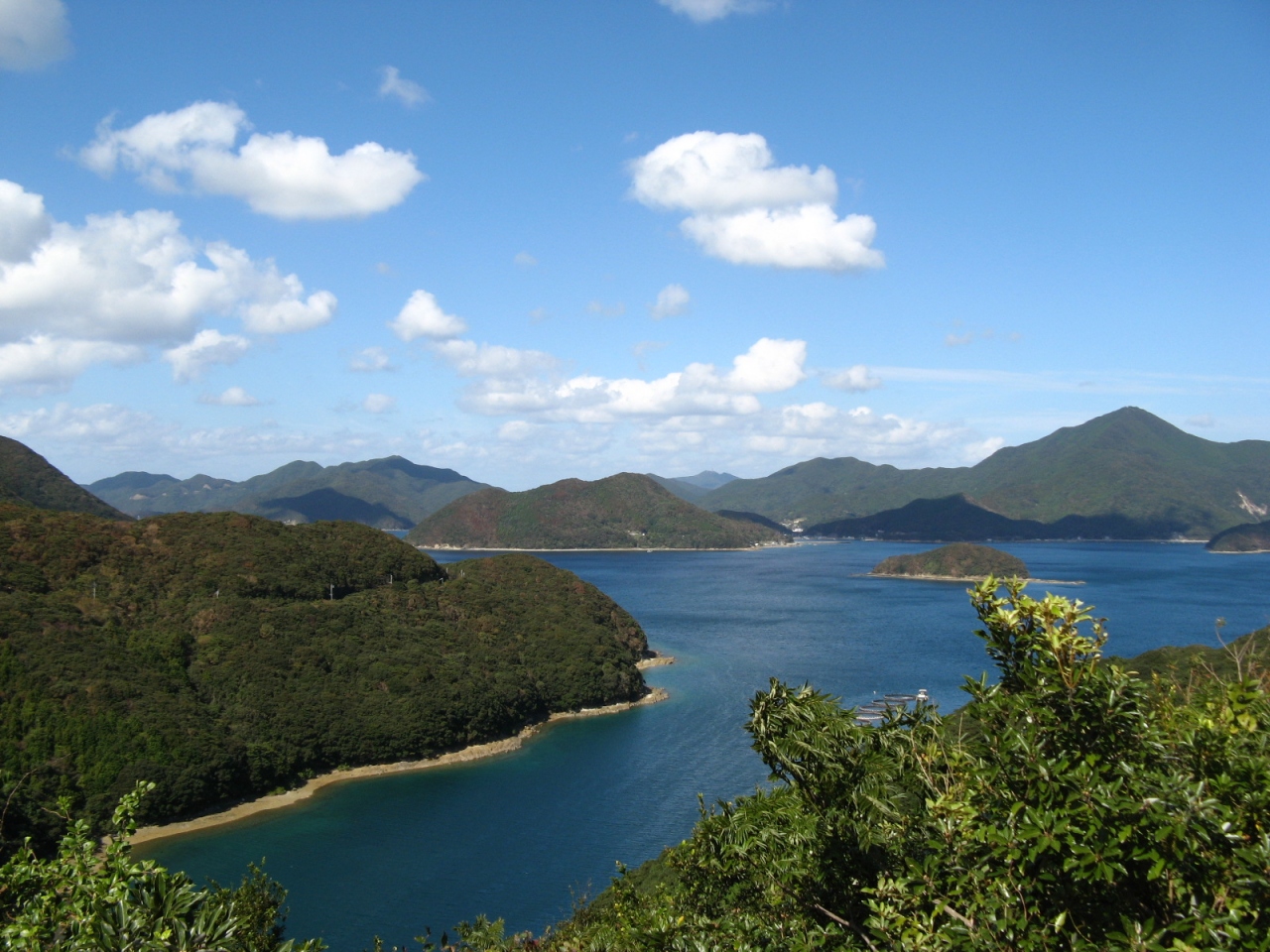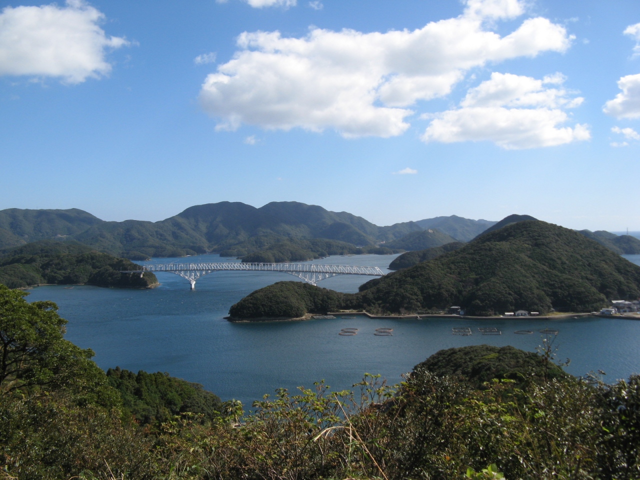 展望所からは青と緑の大パノラマが広がります。中通島と若松島を分けている渦巻く若松瀬戸、数々の島々と複雑に入り組んだリアス式海岸が美しい景観を織りなしています。