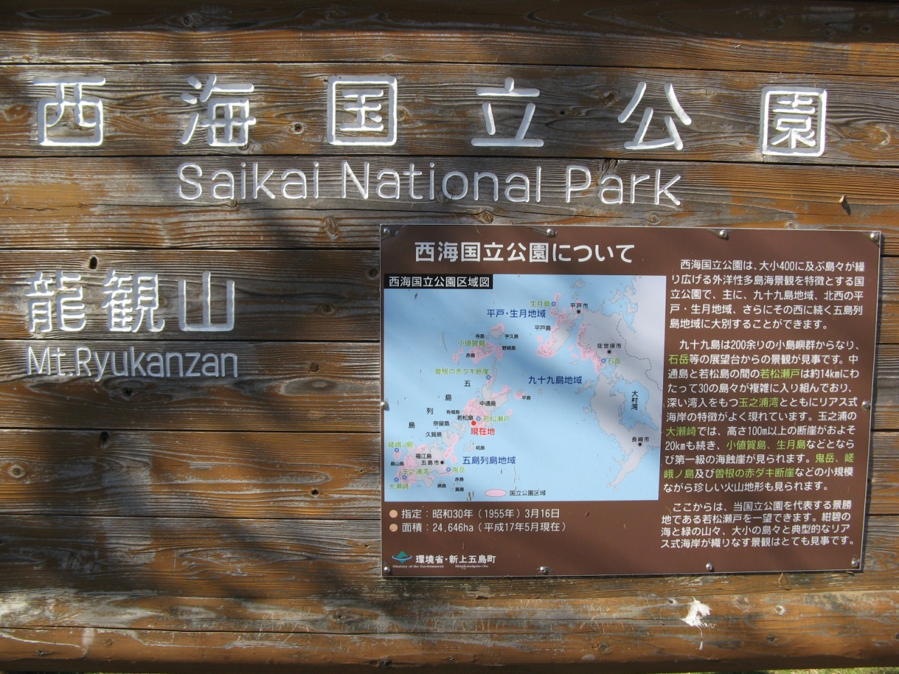 奈良尾港から龍観山までは車で約20分、白いトラス橋の若松大橋を渡り、県道を右に曲がって、若松港の外れから山道をしばらく上って行くと龍観山の駐車場に着きます。そこから5分ほど遊歩道や階段道を登ると展望所へ行くことが出来ます。