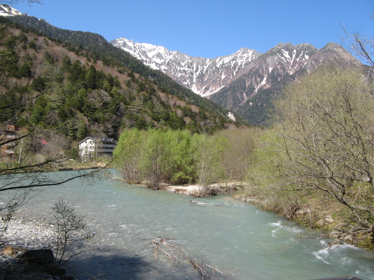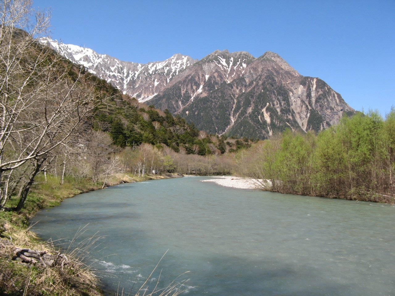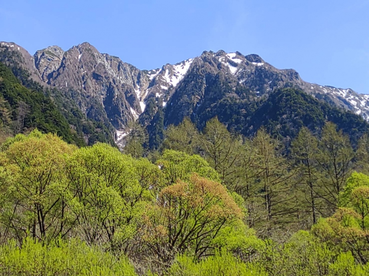 5月中旬に上高地をトレッキングしました。梓川沿いならほとんどの所から穂高岳を観ることができました。天気が良く雪が残る穂高岳は綺麗な梓川の流れと相まって絵の様な美しさでした。次回は10月に来て紅葉の穂高岳を観て見たいと思いました。