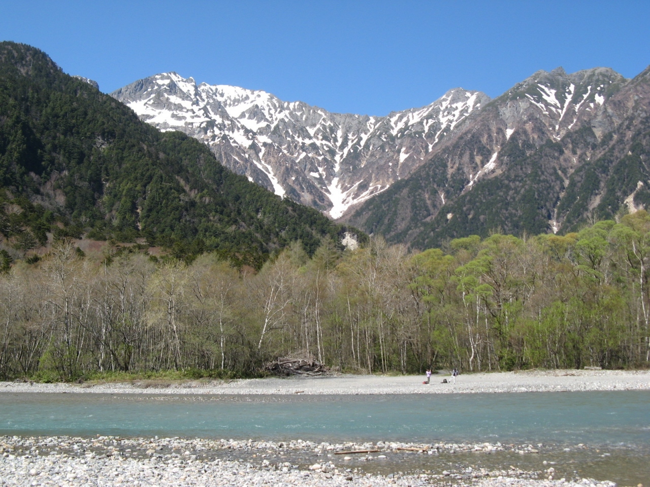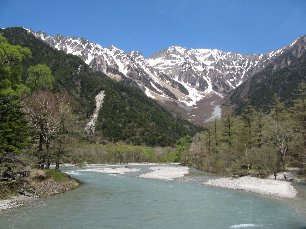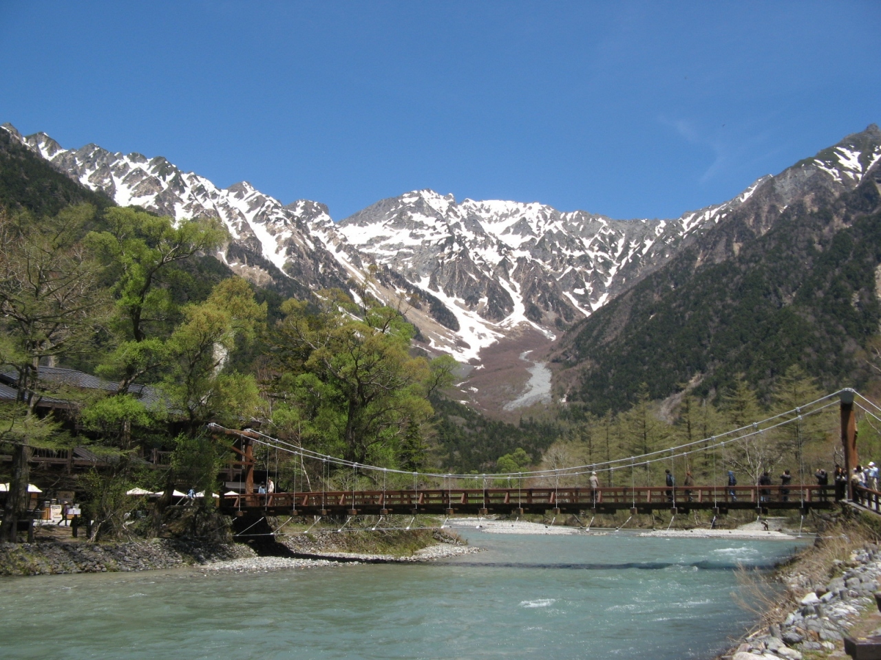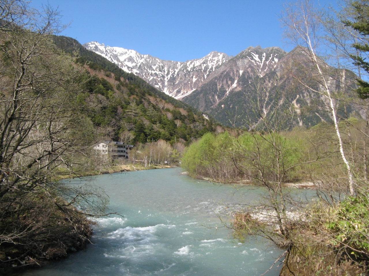 5月中旬に上高地をトレッキングしました。梓川沿いならほとんどの所から穂高岳を観ることができました。天気が良く雪が残る穂高岳は綺麗な梓川の流れと相まって絵の様な美しさでした。次回は10月に来て紅葉の穂高岳を観て見たいと思いました。