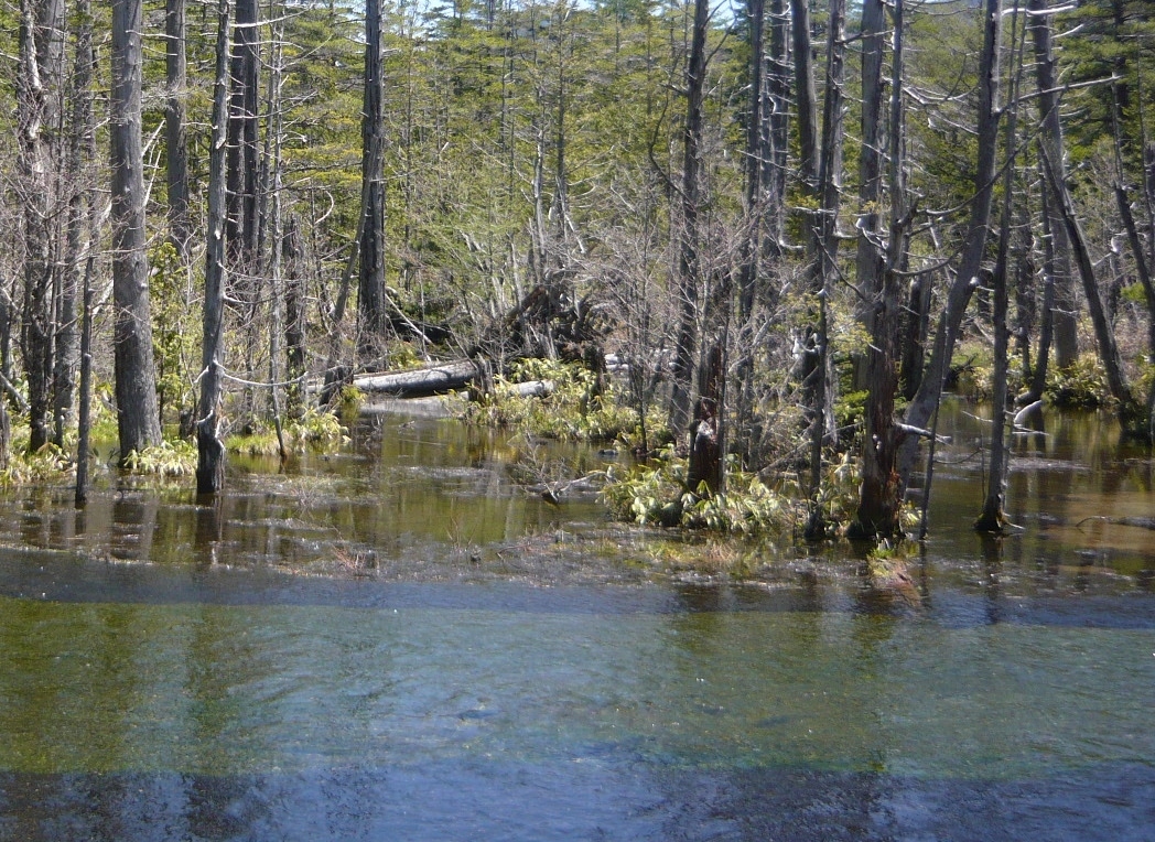 大正池から梓川上流へと10分ほど歩いたところに田代池があります。周辺の山々の沢などからの土砂によって流れがせき止められてできたもので、池というよりで湿原の様な感じです。池辺には朽ち果てた樹々があり水は透明で水草も見えます。魚を観ることはなかったが鴨らしき鳥が遊んでいました。