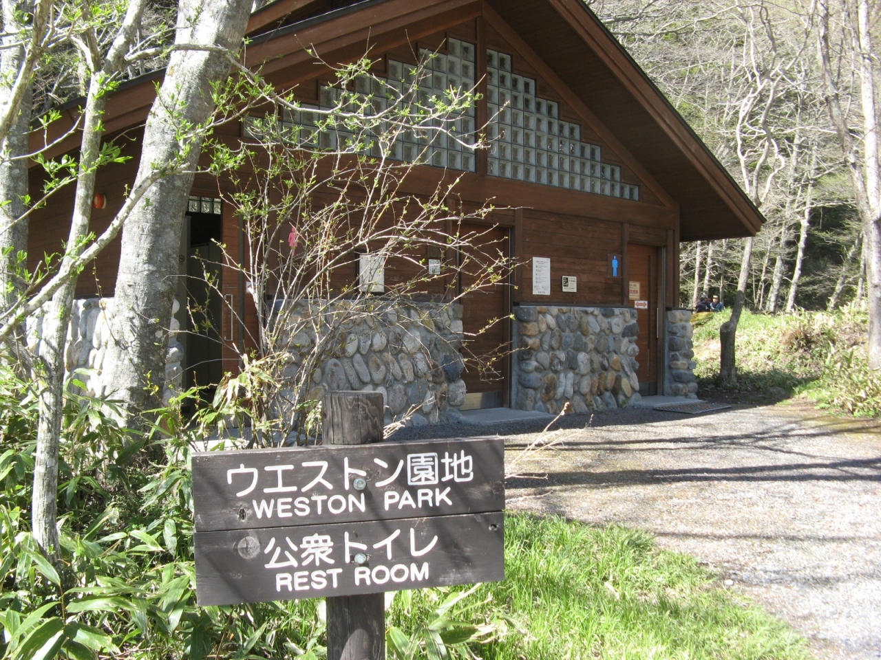 日本アルプスの美しさを世界に紹介し、日本人に登山の楽しさを教えてくれた英国人宣教師を顕彰するウェストン碑の傍にある公園です。100m四方ぐらいの芝生広場で遊具は無く、ウェストン碑を除いて特別観るべきものはありませんが、東屋やベンチ、公衆トイレがあり、休憩するのに便利なところです。