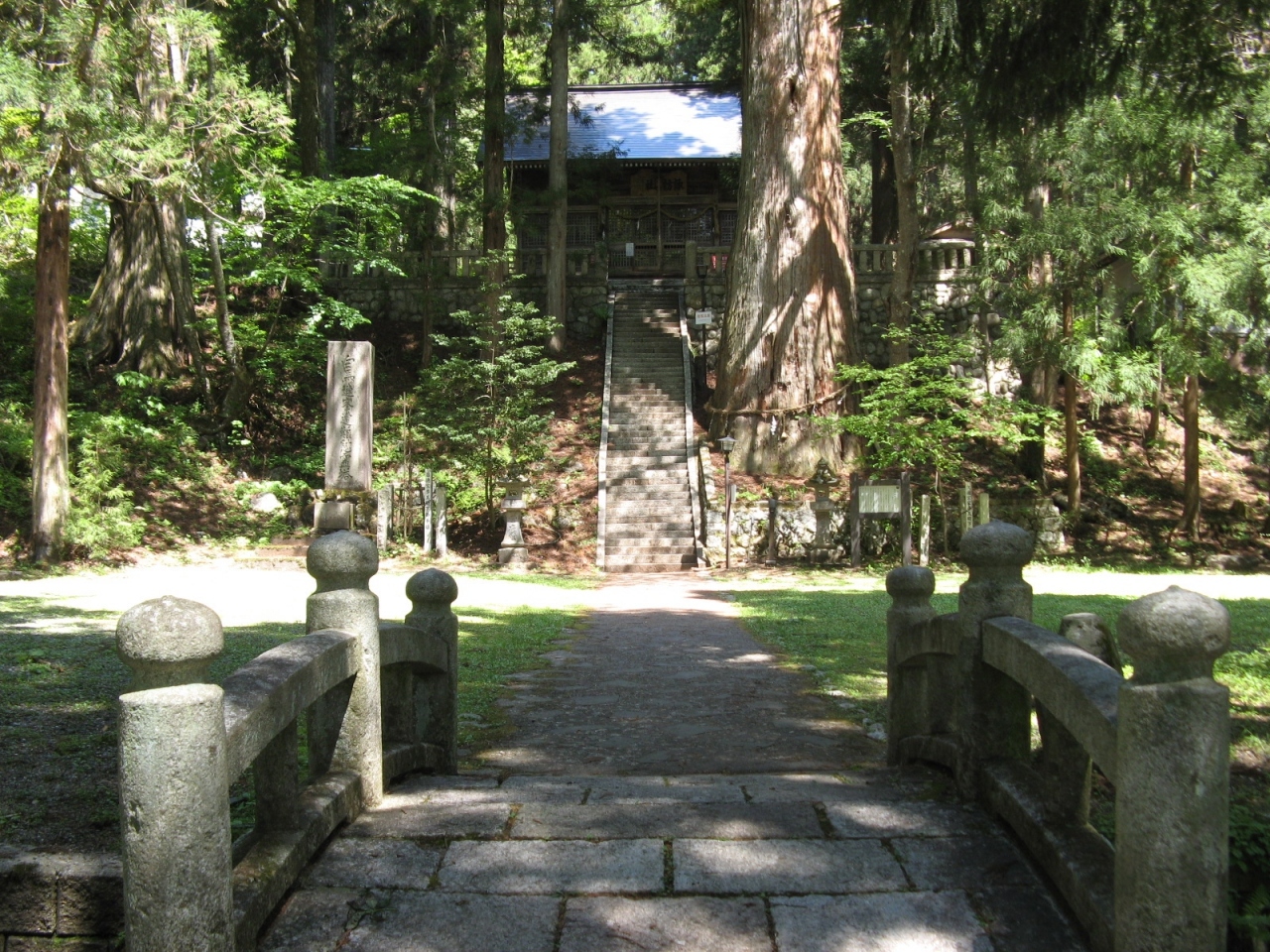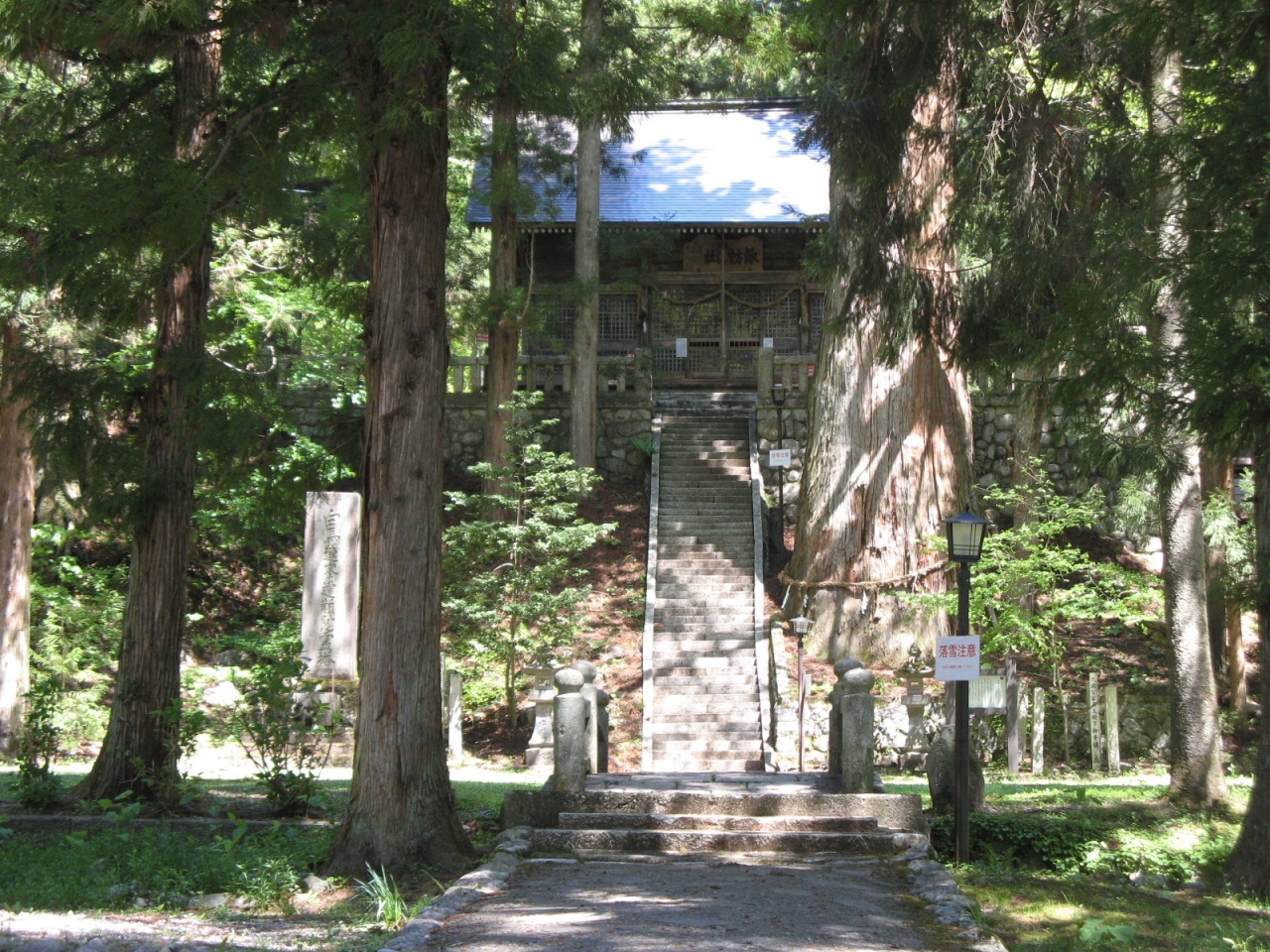 JR大糸線白馬駅より歩いて30分ほどのところに鎮座されています。小さな石橋を渡り、急な石段を上った先に拝殿があります。静かで鬱蒼とした森に囲まれた厳かな境内では、白馬村の文化財に指定されている樹齢1000年の大杉や常陸宮妃華子殿下の歌碑、白馬連峰遭難慰霊塔などを観ることができました。