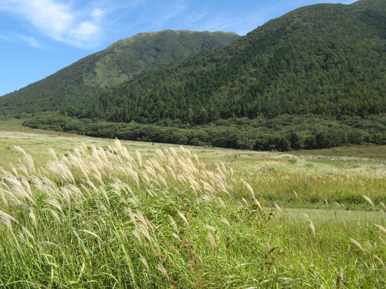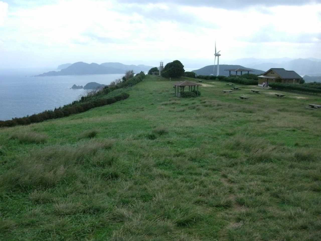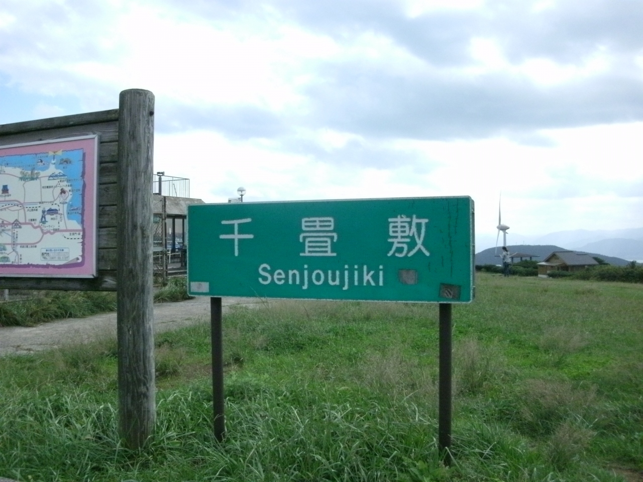 「千畳敷」という名所は国内に数か所ありますが、海の近くの千畳敷は海岸の岩場が平らに広がっている(白浜とか深浦の千畳敷)イメージだったのですが、ここは、海岸に近い高台に広がる草原のようなところでした。眼下には日本海が広がり、遠くに青海島を見渡すことができます。草原の中には東屋やベンチが所どころに置いてあって、天気が良ければ海を見ながらのんびりするのにいいところです。手前に、広い無料駐車場がありました。