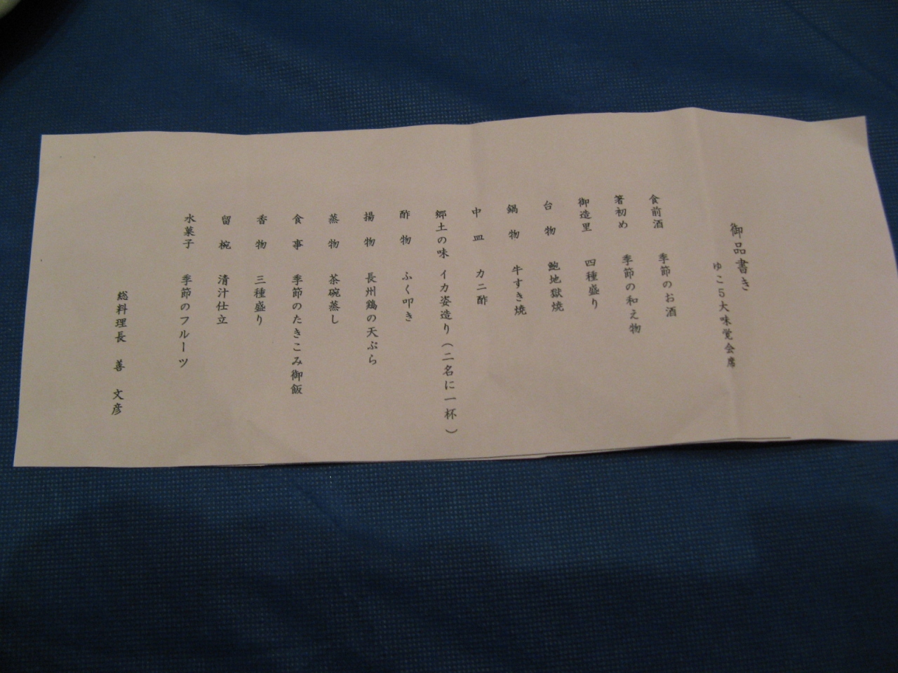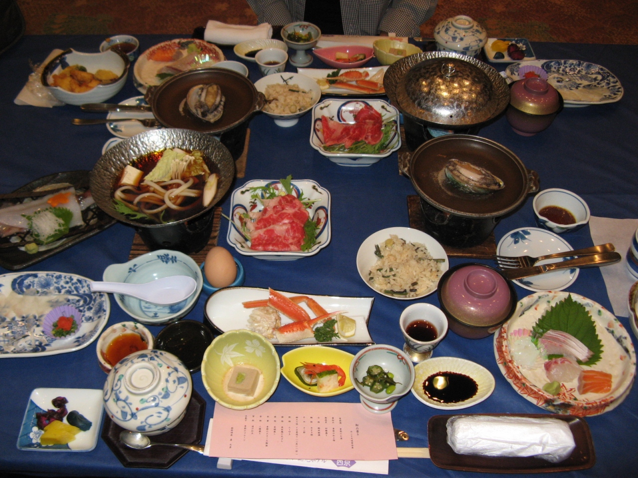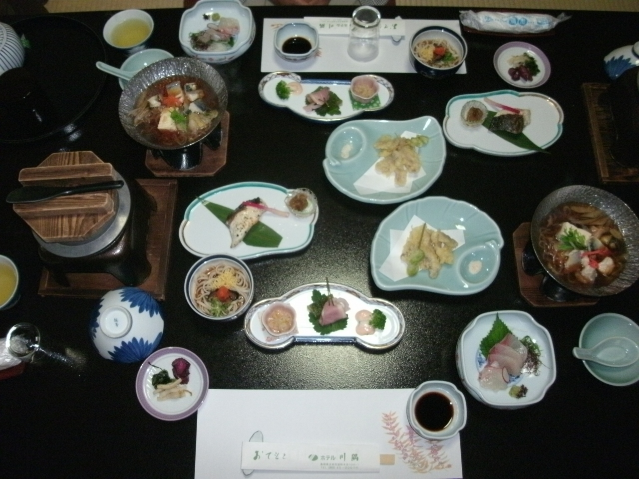 食事は、食事処で頂きました。夕食は、13品の会席で、アワビ地獄焼きやカンパチなどの刺身、イカ刺とゲソ天、フグの叩きなど魚介を使ったものが美味しかった。朝食はバイキング方式でとくにこれといったものはありませんでした。