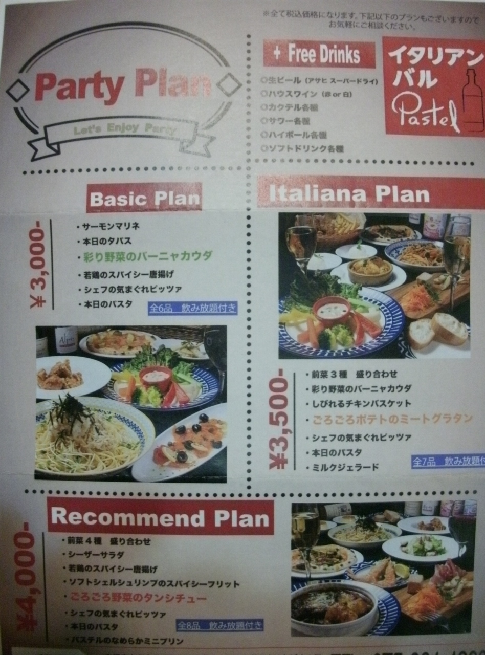 そんな中から、事前に予約していた、“4000円のパーティプラン”を頂きました。料理は、前菜4種、シーザーサラダ、タンシチュー、エビのフリット、ピザ、パスタなど8種類で、ドリンク(ビール、サワー、焼酎、ハイボール、コーヒー、紅茶など)は2時間飲み放題付き。料理はそれぞれが2つの大皿に出てくるシステムで、それを5人でシェア。特別、印象に残る料理はなかったが、タンシチューとデザートに出てきたプリンは美味しかった。なお、友人に聞くと、このお店の“なめらかプリン”は人気があるそうで、店内でも売られていてテイクアウトできるようになっていました。