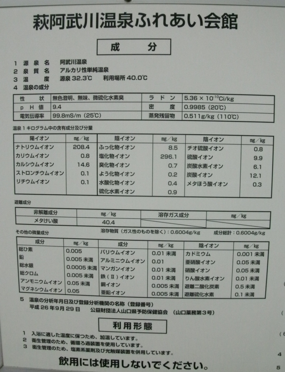 阿武ダムを見学した後、「阿武川温泉ふれあい会館」の温泉に入りました。内風呂は20人ぐらい入れる大きさで、その奥に露天風呂もありました。別料金だったので利用しませんでしたがサウナもありました。お湯は源泉温度が低いので加温している用でしたが、無色透明のお湯は少し硫黄の臭いがするので温泉らしい雰囲気はありました。