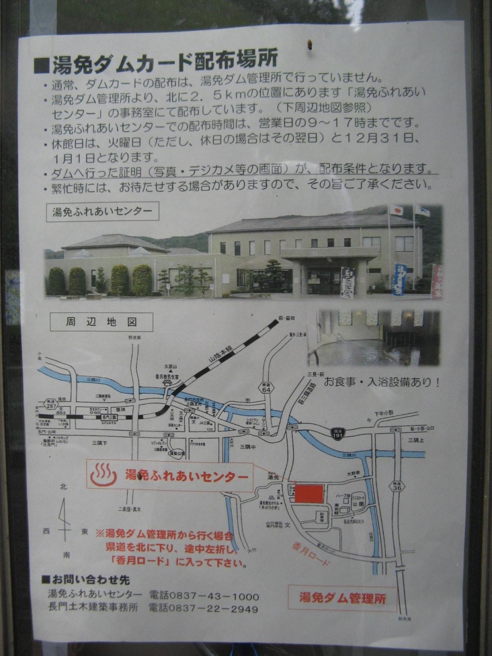 管理所は通常無人になっているらしく、入口に『ダムカードは、ダム管理所より北に2.5km行ったところにある“湯免ふれあいセンター”で配布します・・・』と書かれた表示(詳細は添付写真を参照ください)があったので、ダム見学後、ダムを訪れた証拠写真を持って“湯免ふれあいセンター”に出向いてダムカードを頂くことができました。- 旅行時期