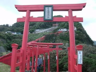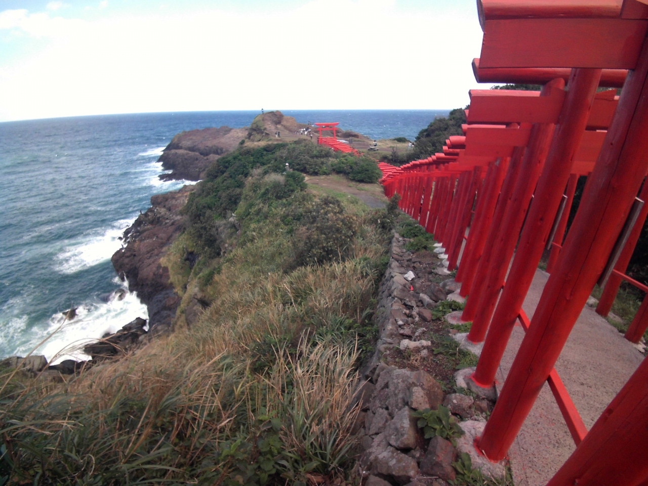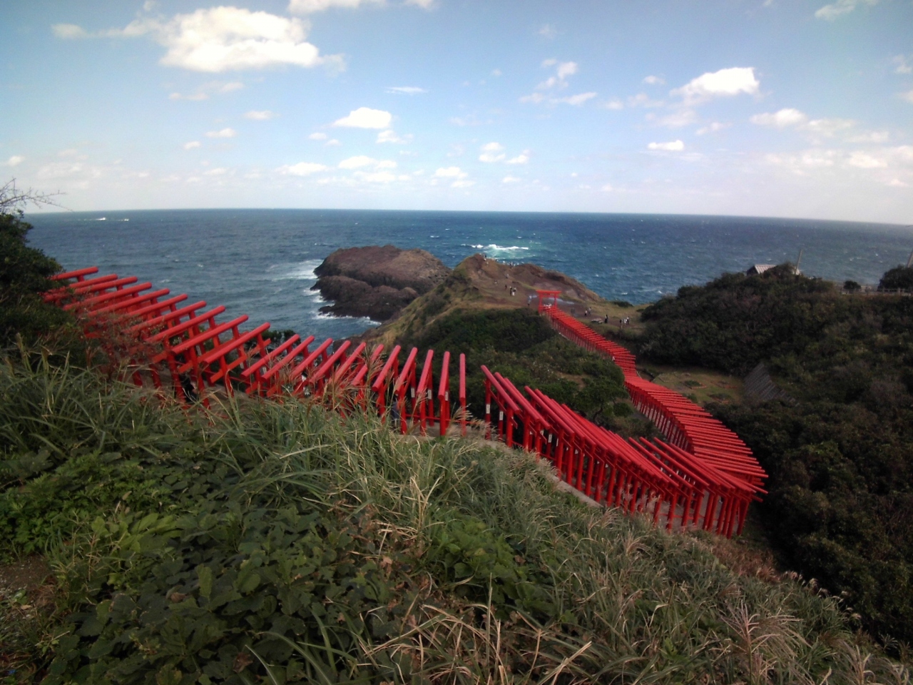 海に向かって伸びる123基の赤い鳥居は不思議な感じがする風景でとても見ごたえがありました。参道入り口にある、高さ5mほどのところに設置された日本一入れ難い賽銭箱も面白いものでした。