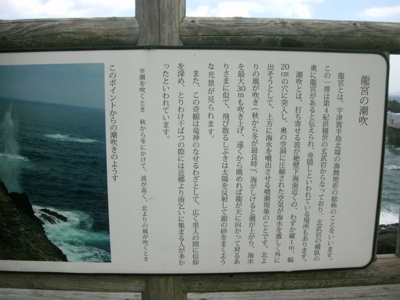 現地にあった説明板には『潮吹とは、打ち寄せる波が絶壁下海面近くの、わずか縦1m、幅20cmの穴に突入し、奥の空洞に圧縮された空気が海水を激しく外に出そうとして、上方に海水を噴出させる噴潮現象のこと・・・』とありました(添付写真を参照ください)。