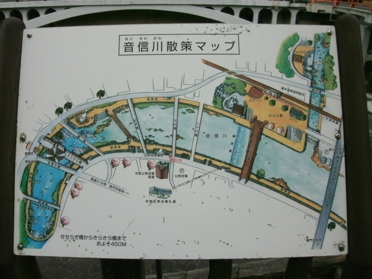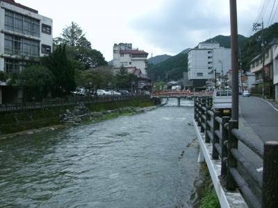 音信川(おとずれがわ)沿いにたくさんの温泉旅館が立ち並び温泉街をつくっています。訪れたときは、前日に大雨が降って音信川が増水し、川の両岸に造られた遊歩道や足湯施設などが一部水没していて散策することができませんでした。