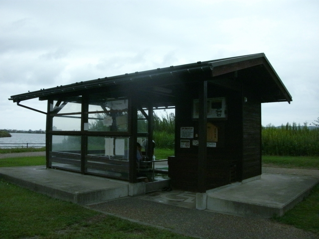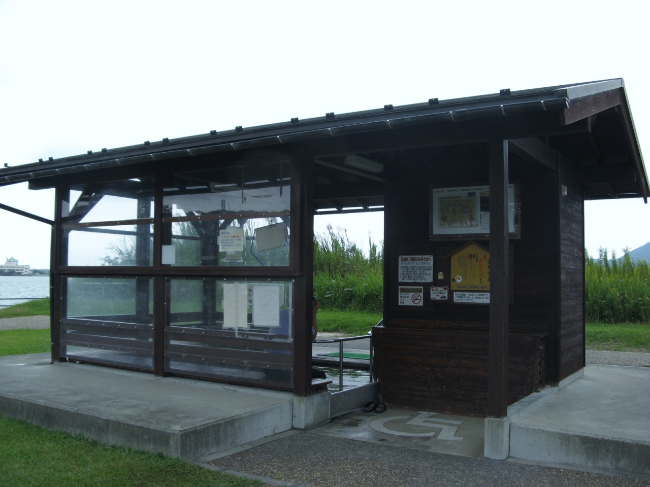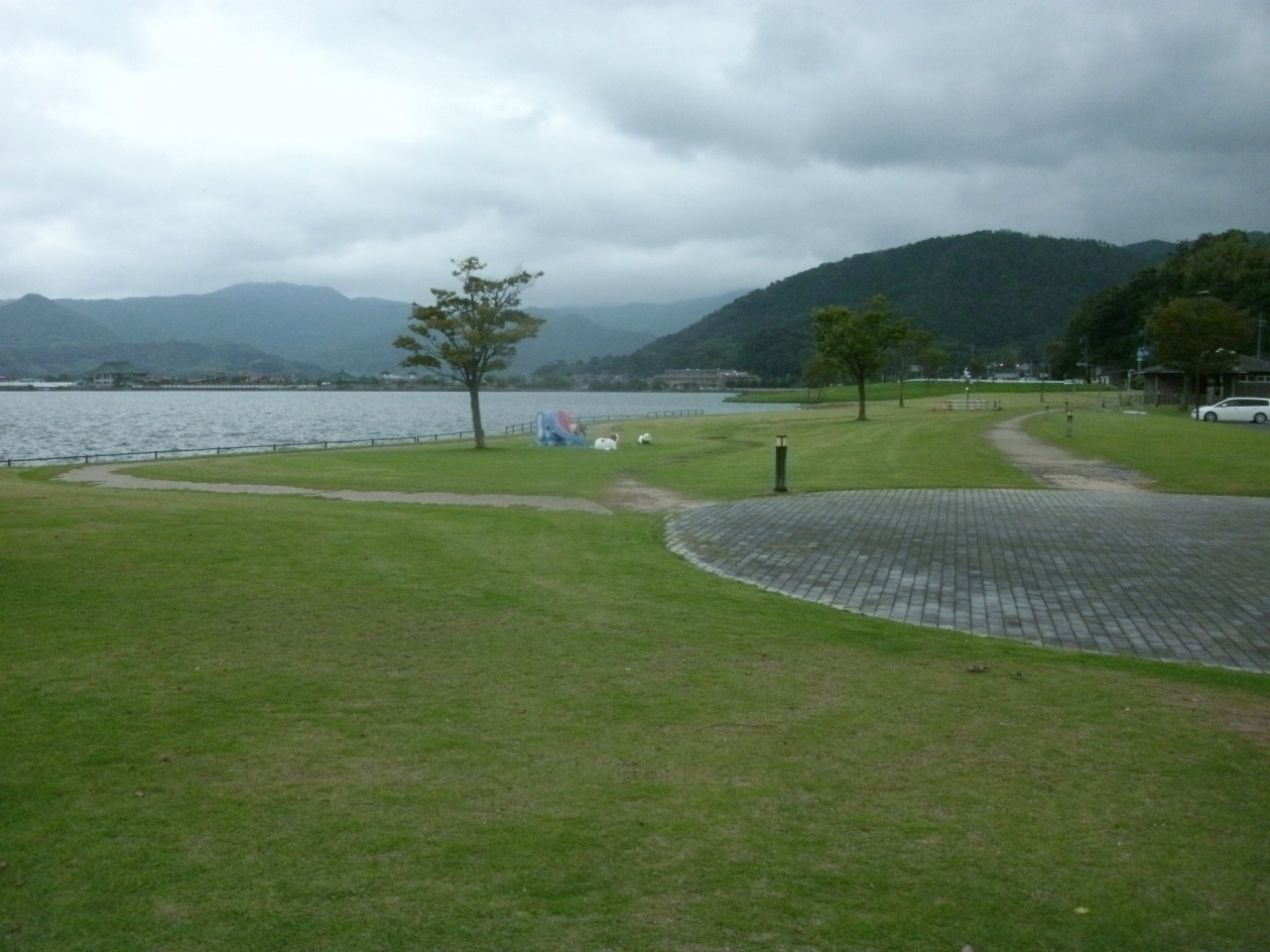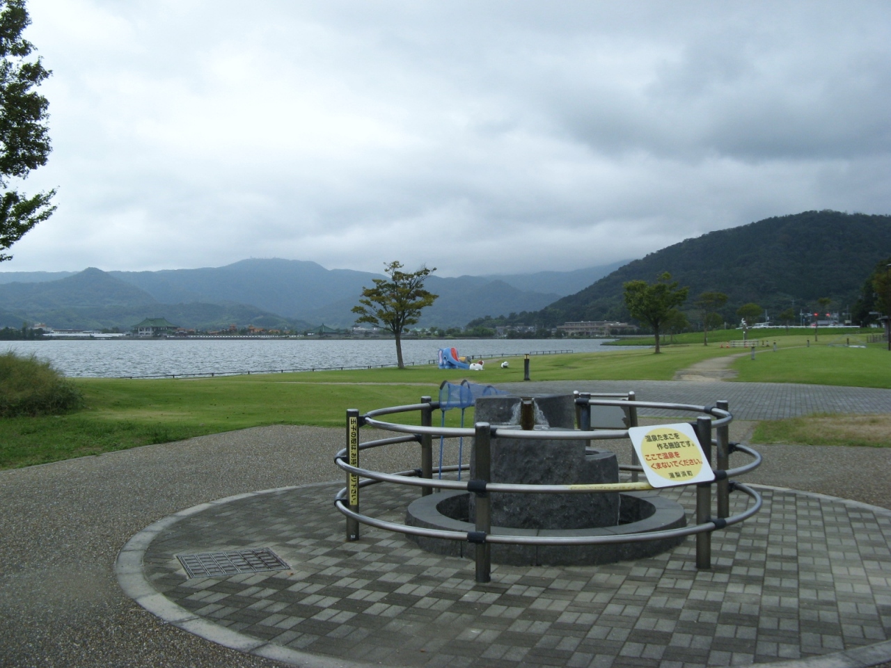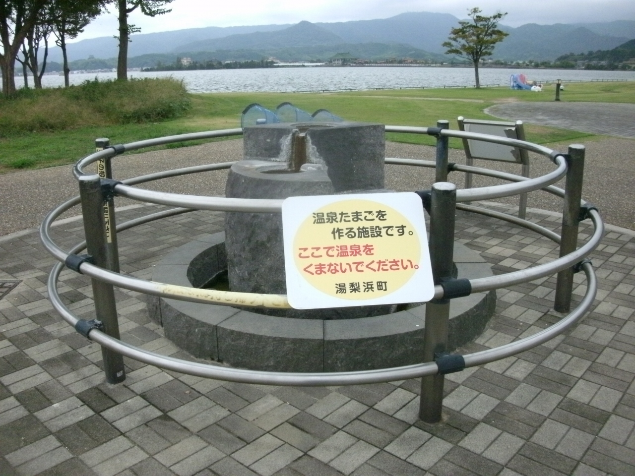 東郷池の南岸にある広い公園です。芝生広場に子供用の遊具や無料で利用できる屋根付きの足湯施設、温泉卵を作ることができる場所があります。近くに卵を売っている場所がないので卵は持参する必要があります。