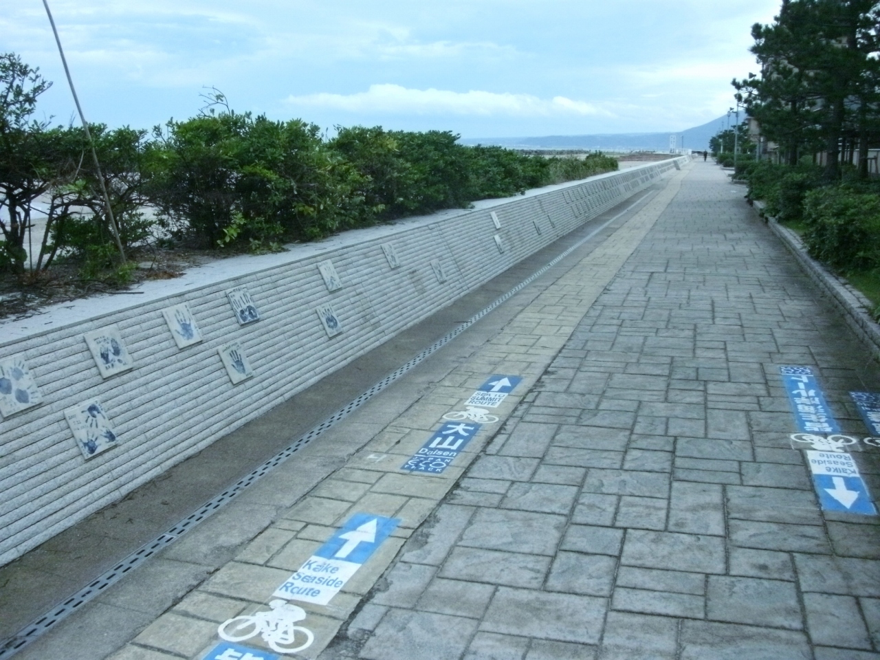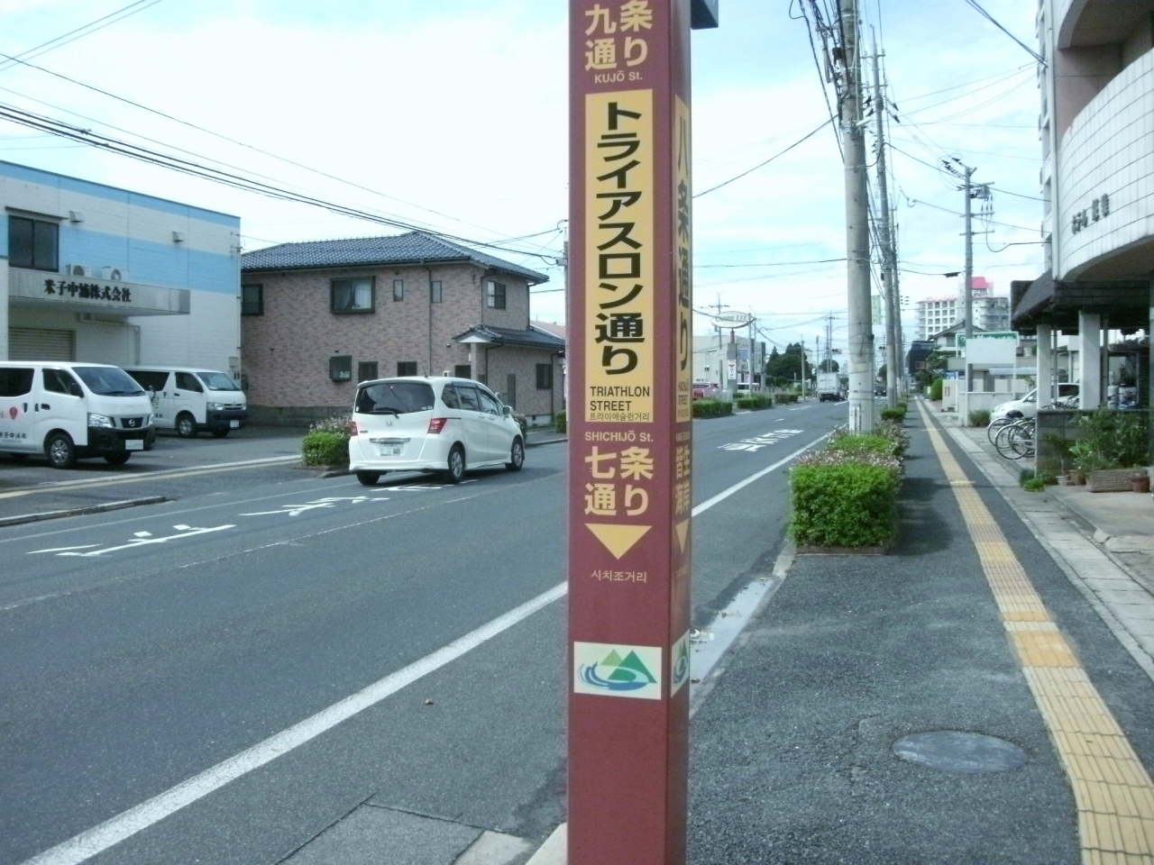 県道300号線、米子市観光センターの前の道路に「トライアスロン通り」という標識があります。皆生温泉は国内のトライアスロンの発祥の地で、1981年に国内で初めてトライアスロン大会が開かれ、その後毎年7月に全日本トライアスロン皆生大会が開かれているそうです。