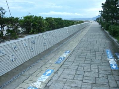 観光センターから県道300号線、「トライアスロン通り」を東に進み、最初の交差点を左手に曲がって(三条通り)海岸方面に歩いて行くと突き当りに、日本トライアスロンの発祥を記念して作られた記念碑がありました。