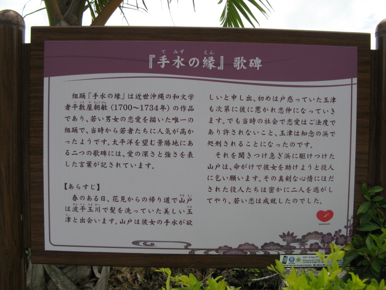 現地にある、歌碑の説明には『美しい女性に手水を乞い、飲ませてもらった男性が女性と恋におちるも、当時の社会では恋愛はご法度で、女性が処刑されそうになるが男性が助けて幸せになった。』という意味のことがかかれています。詳細は写真を添付しますので参照ください。