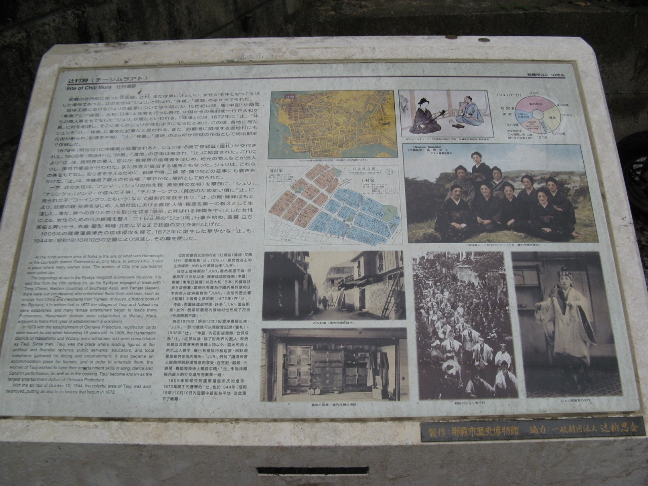 説明用の標石には『琉球王府時代より、唐や東南アジア諸国、日本の要人たちをもてなす「ジュリ」と呼ばれた遊女らが暮らし、独自の芸能・料理文化を発展させた花街の跡です。1897年(明治12年)の沖縄県設置(琉球処分)以降、政財界の要人や役人、地元の商人などの接待や宴会、宿泊する場所として栄え、沖縄県下最大の社交場であったが、1944年(昭和19年)10月10日の空襲により消滅し、その幕を閉じた。』という意味のことが記載されています。