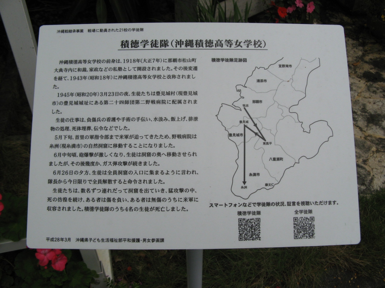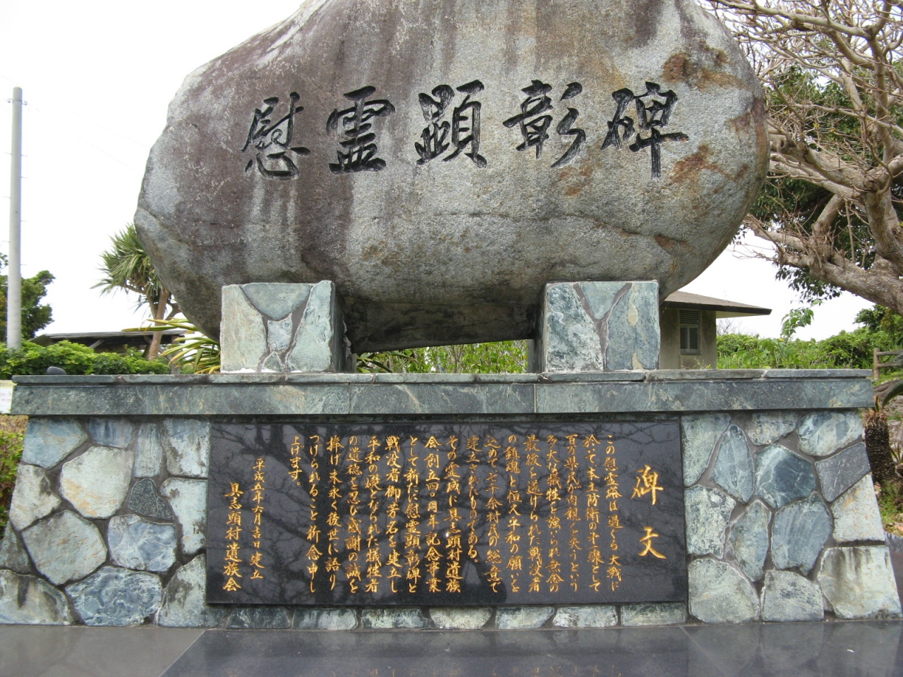 先の大戦において、沖縄で戦没された方々の御霊をお祀りされています。慰霊顕彰碑は“具志頭城跡”にあって、糸満市側から行くと国道331線と国道507号線の交差する点を過ぎて、八重瀬町役場を左に見て400mほど行くと、右手に斜めに入る路地があります、そこから道なりに400mぐらい行くと城址の敷地内駐車場に到達します。