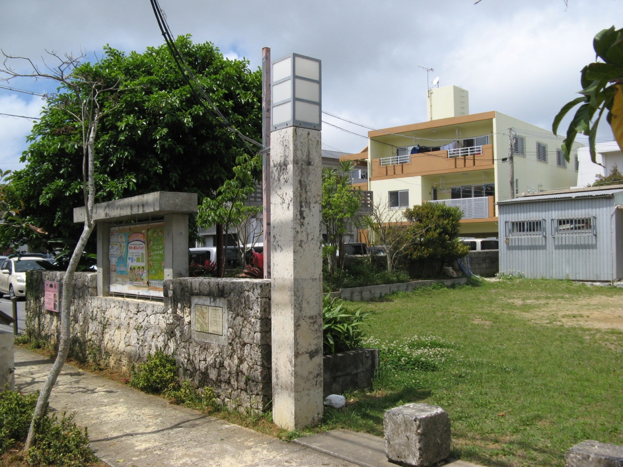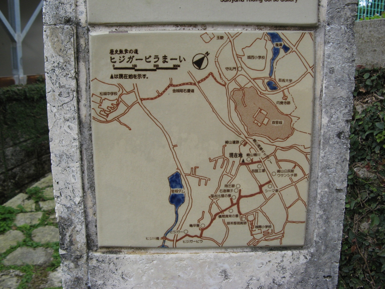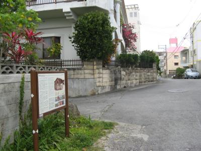 首里城の南、歩いてすぐ、首里崎山の馬場(瑞泉)通りにある崎山公民館の石塀に「崎山馬場御座敷跡」の説明板がはめ込まれています。