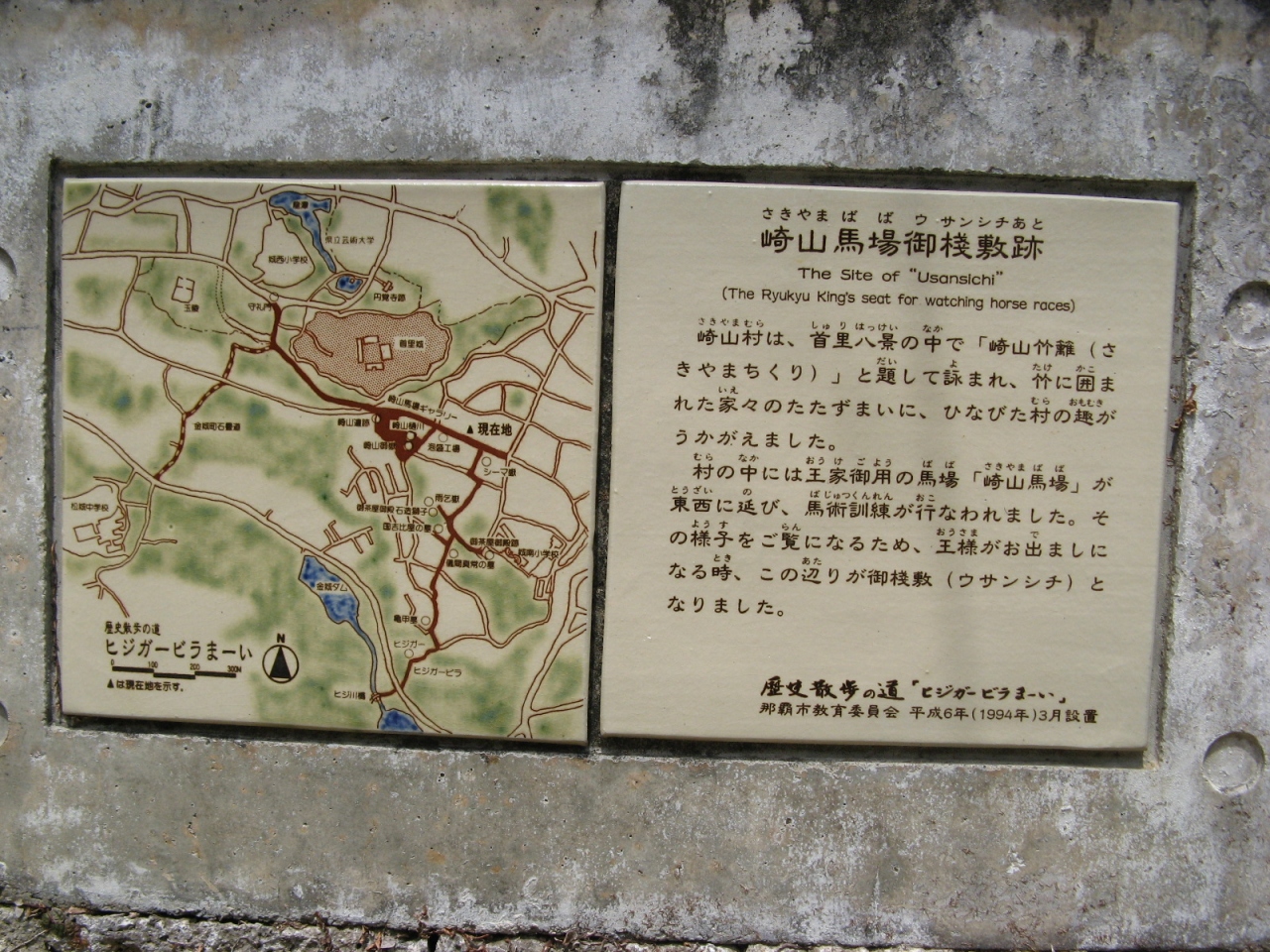 「崎山馬場」は琉球王家御用の馬場で、東西約200m延びる道路では馬術訓練などが行われ、現在の崎山町公民館がある一帯は、国王が馬術訓練の様子や崎山村の綱引きを見物する際に御桟敷が設けられたそうです。