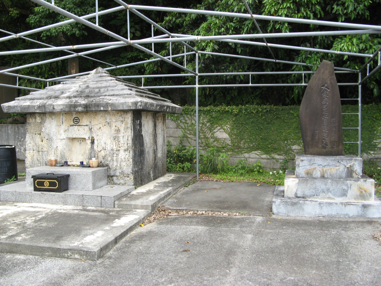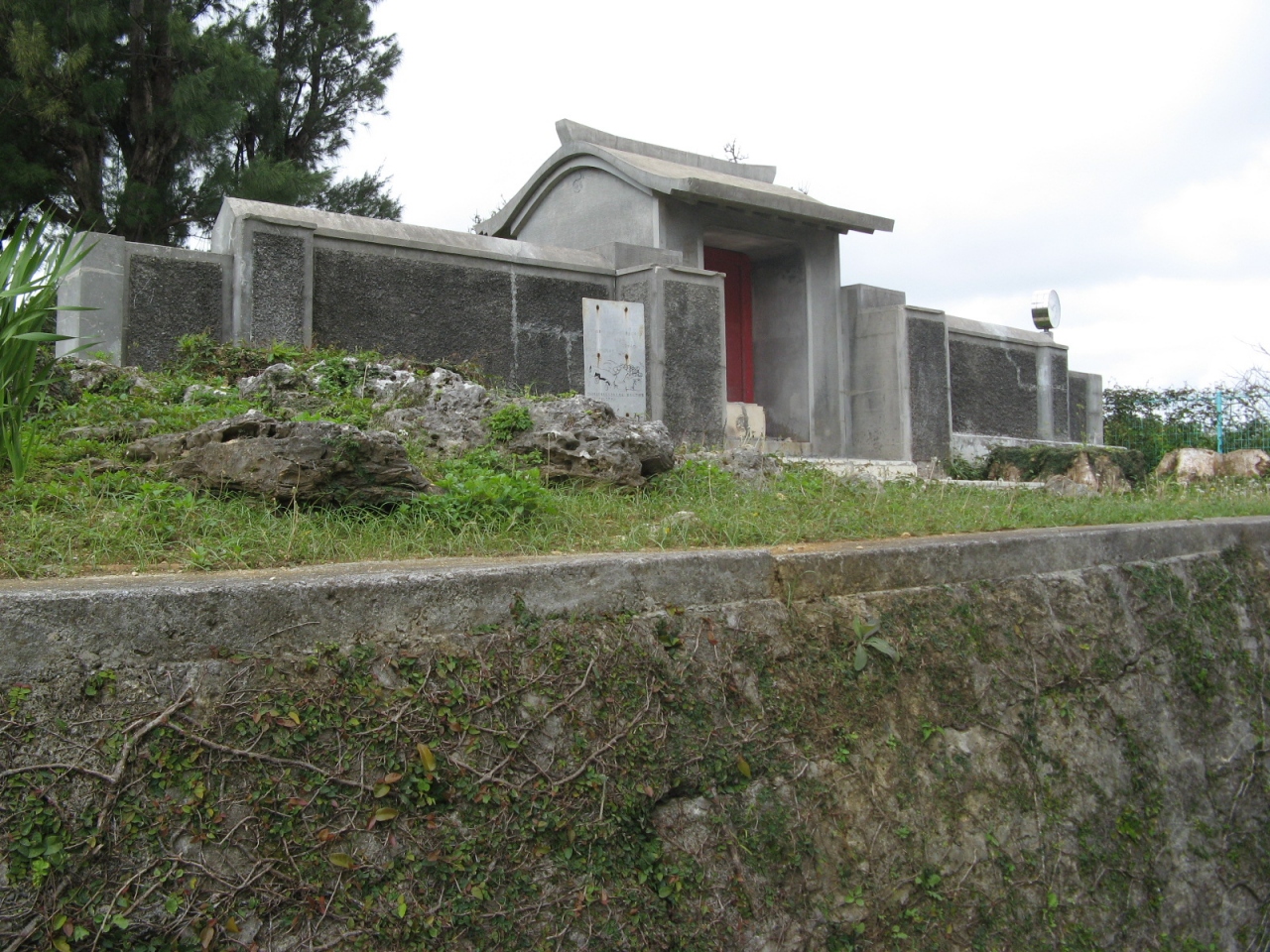 お墓は、亀甲墓が多い沖縄にあって家屋造りの珍しい墓です。沖縄に多い国吉家の始祖となっていて、沢山の方が参拝されるようで、お墓の周りにはテント用の支柱のようなものが設けられています。