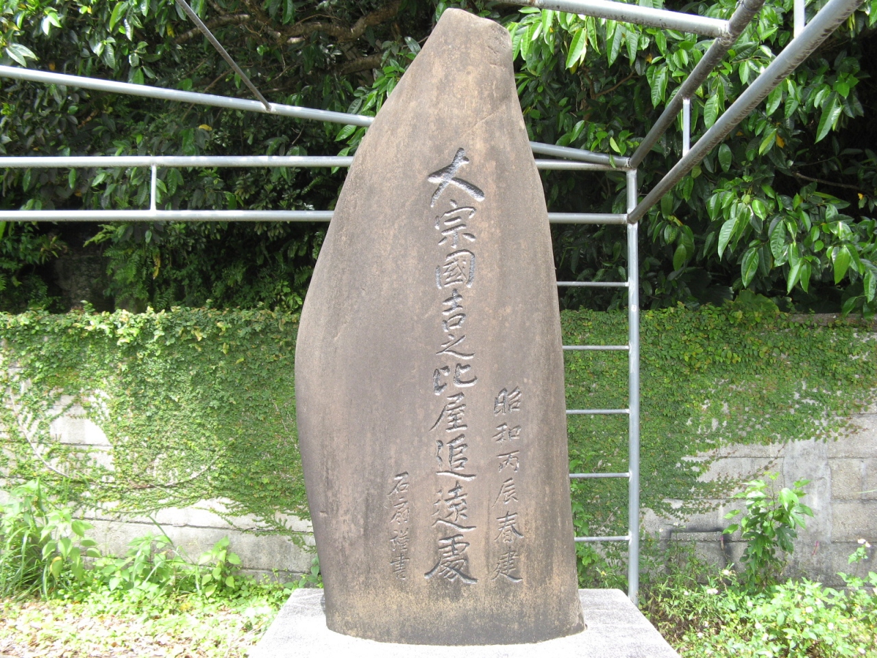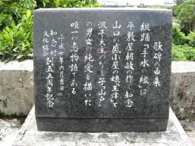 海を臨む国道沿いの高台に建てられた歌碑は立派なもので、左の歌碑には『くらさらぬ 忍で来やる 御門に出ぢめしやうれ 思ひ語ら』、右の歌碑には『結でおく契り このぢやでともな 変るなやう互に あの世までも』と刻まれています。右の歌碑は、“結んだ二人の約束は、この世のものだけと思うな、お互いに心変わりをするな、あの世までもの約束だから”という意味でしょうか、心に強く残りました。