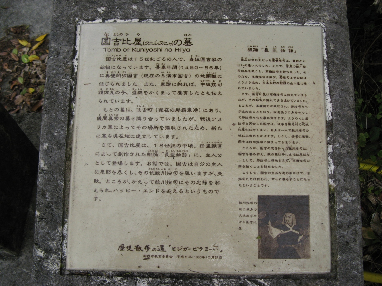 国吉比屋は15世紀ごろの士族で、尚氏6代の王に仕えながら晩年に謀反を疑われて自害した護佐丸の子盛親をかくまい養育した忠義の人で、沖縄の組踊り“義臣物語”にも主人公として登場しています。詳細は添付、説明板の写真を参照ください。