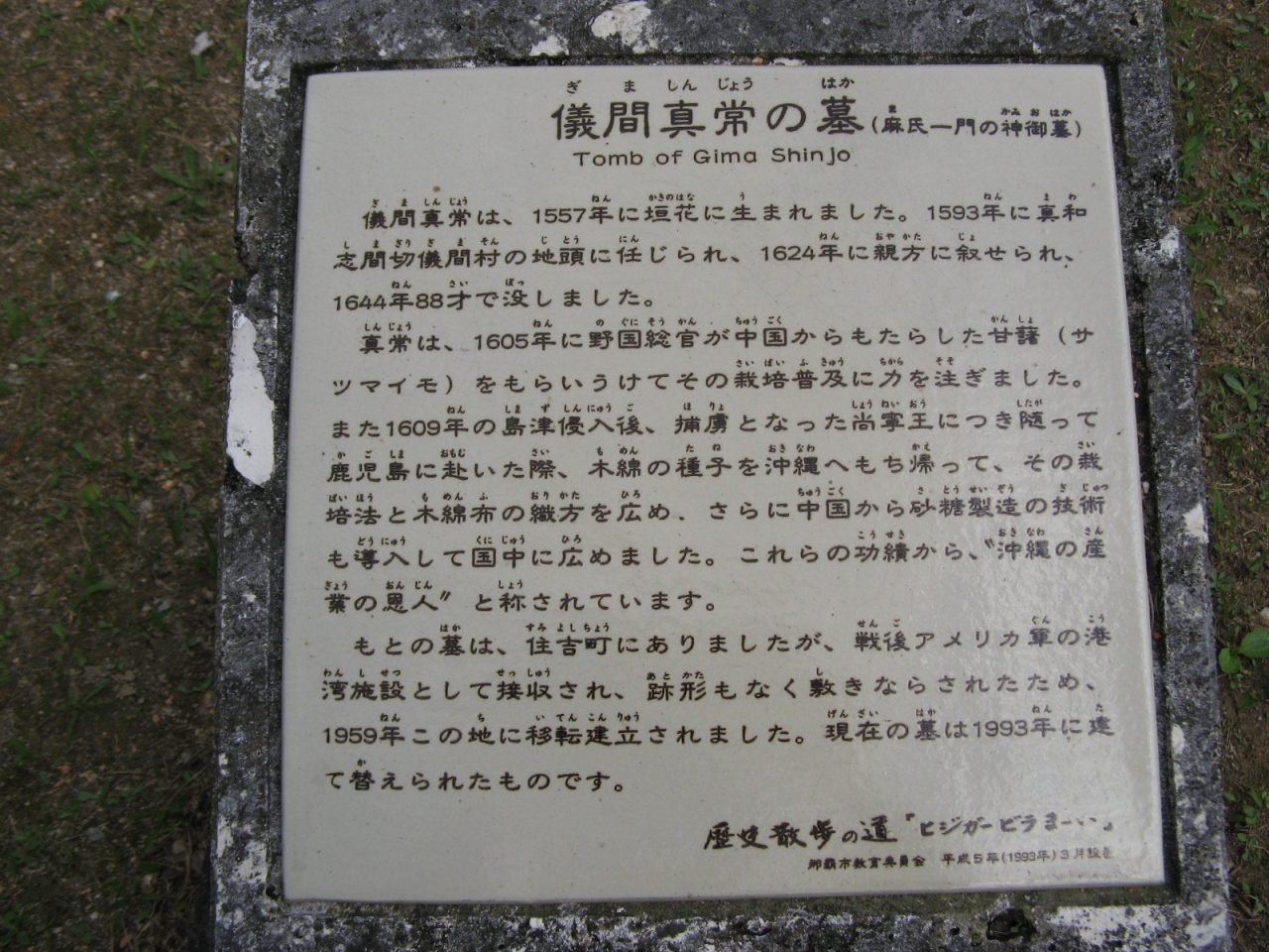 儀間真常は、1557年生まれ、サツマイモや木綿織り、 砂糖の製造技術を国中に広め、沖縄を支える産業を起こした人で琉球五偉人の一人と呼ばれています。もともとは、那覇港の近くにあったが、戦後、アメリカが接収して跡形もなくなったことから、現在の地に移し替えられたとか。那覇市の指定文化財となっています。