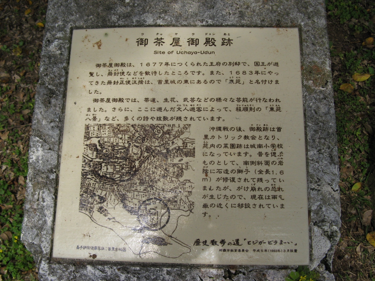 御茶屋御殿は1677年に造られた王府の別邸で、国王が遊覧し、中国からの冊封使などをもてなしたところだそうで、沖縄戦で苑内の建造物は全て破壊され、現在、跡地には、カトリック首里教会が建ち、苑内の菜園跡は城南小学校になっています。