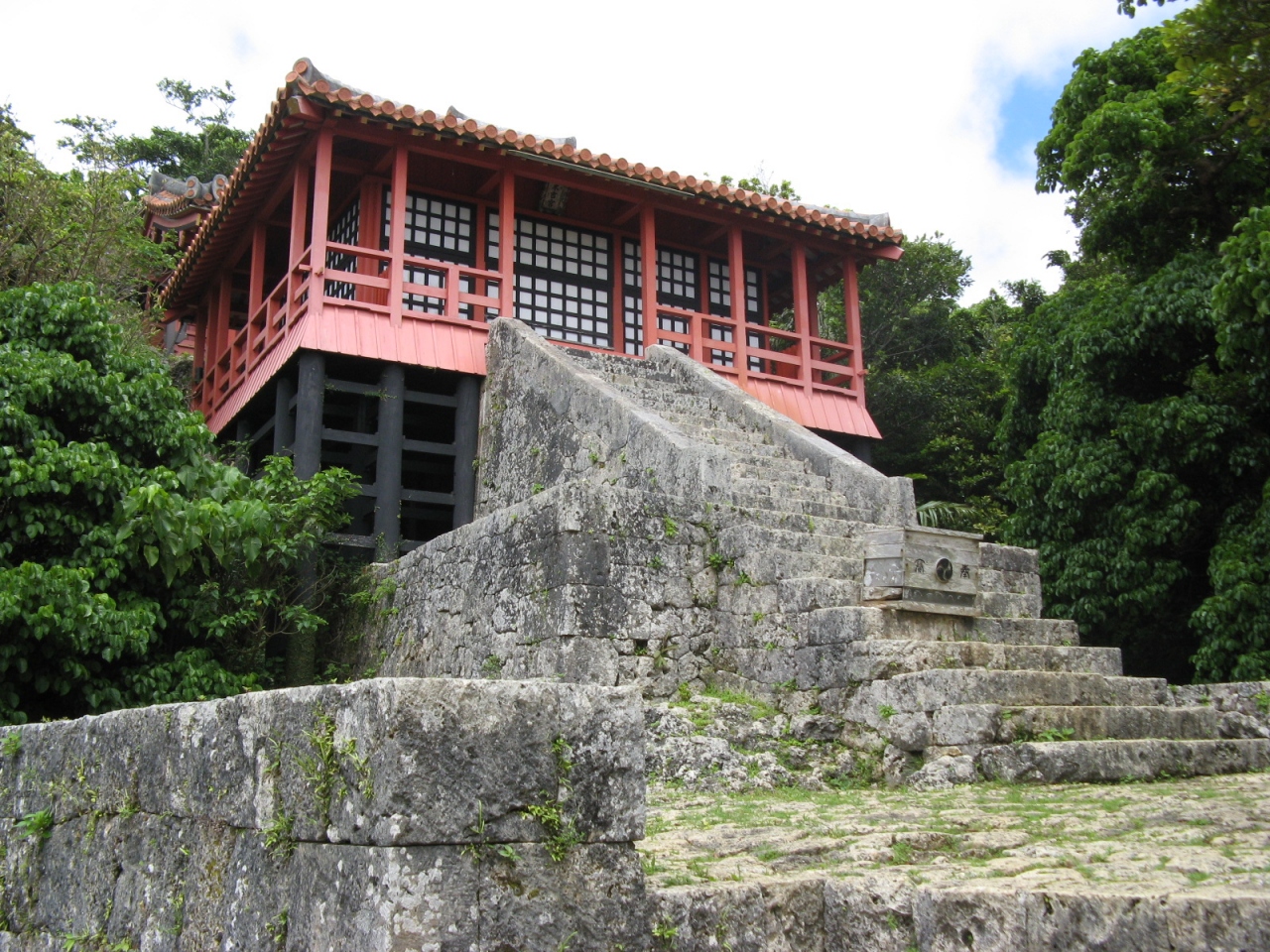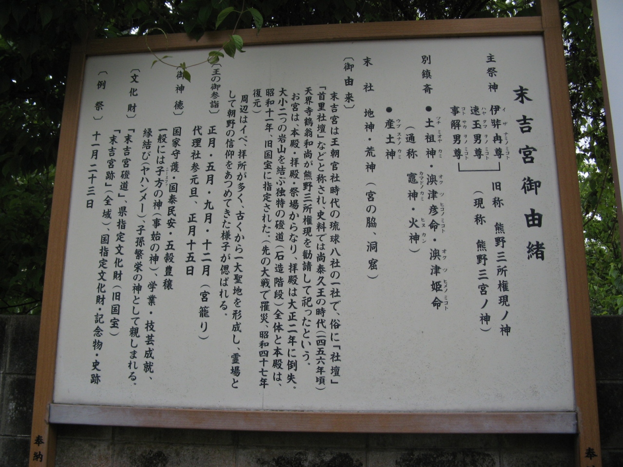 参道の入り口には、“末吉宮大名口参道”と書かれた立派な標柱と由緒書きがあります。参道を少し進むと、人気のない山道になりさらに5分ほどうす暗い山道を歩いて行くと末吉宮跡に至ります。末吉宮跡は、1930年に国宝に指定された本殿があったところで、沖縄戦で崩壊されてしまいました。 現在見ることが出来る社殿は、残った礎石と資材を基に昭和47年に復元されたもので、周辺一帯が「末吉宮跡」として国の史跡に指定されています。社殿は琉球神社様式で建てられていて赤瓦の屋根や朱色の柱が沖縄の青い空とよくマッチし見ごたえがあります。参道の途中は薄暗いところもあって、蛇が出そうで気味が悪い場所もありますので、注意して参拝されるとよいでしょう。- 旅行時期