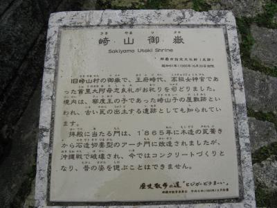 現地案内板によると、崎山御嶽は察度王の子・崎山子の屋敷跡だといわれているとのこと。拝殿にあたる門は、1865年に木造瓦葺きから石造のアーチ門に改造されたが、沖縄戦で破壊され、現在のコンクリート造りになったとか。詳細は添付写真を参照ください。