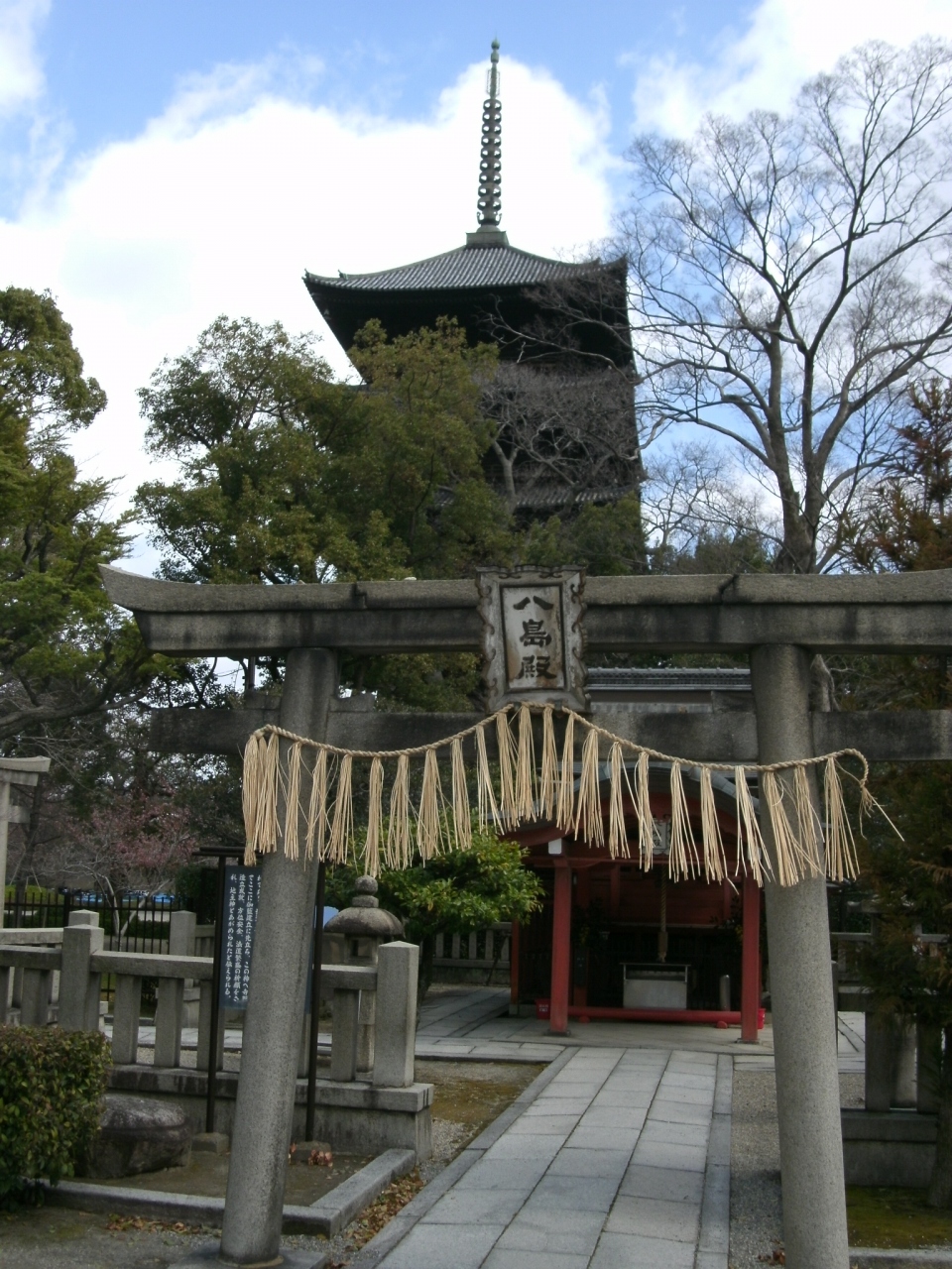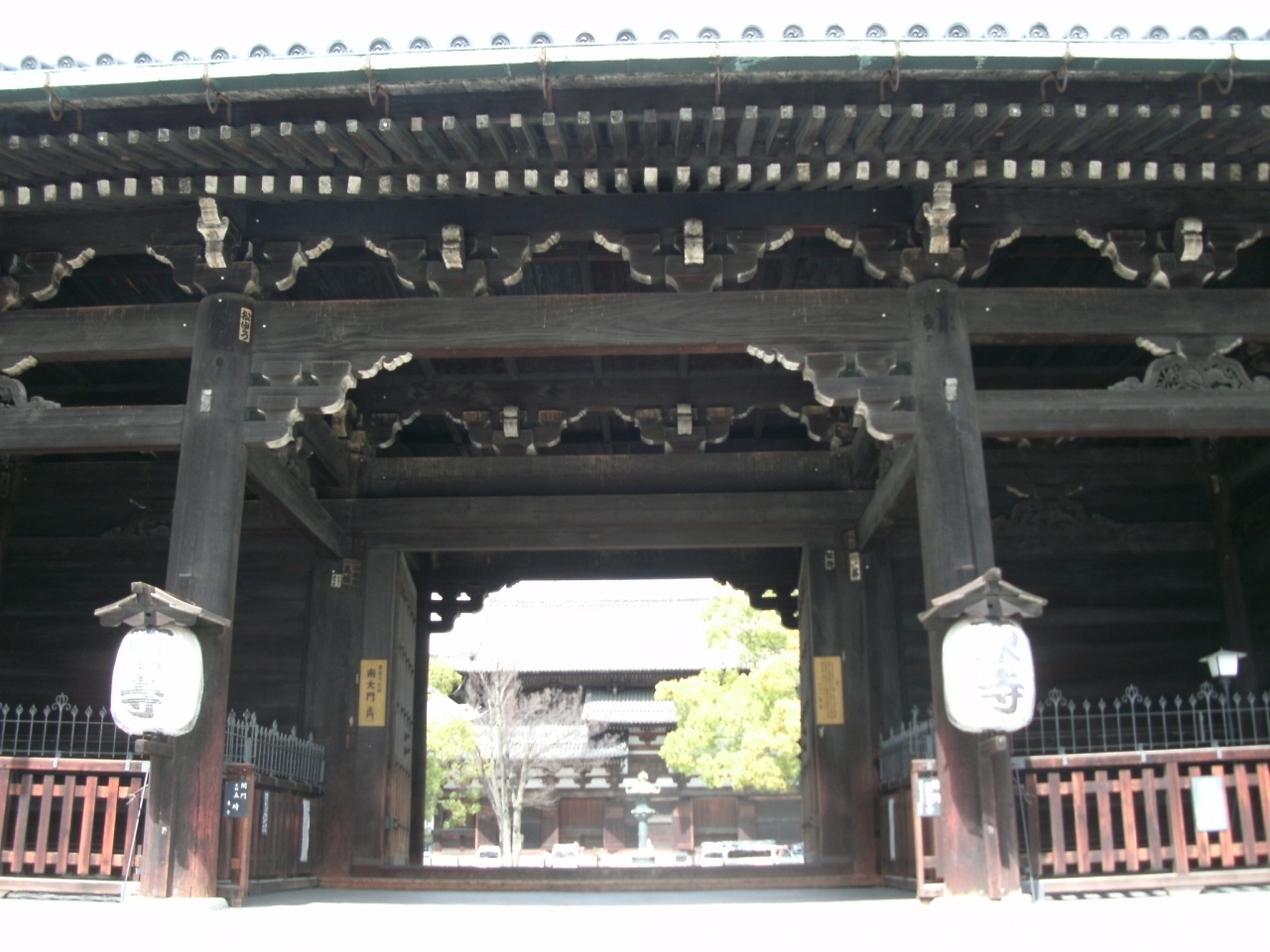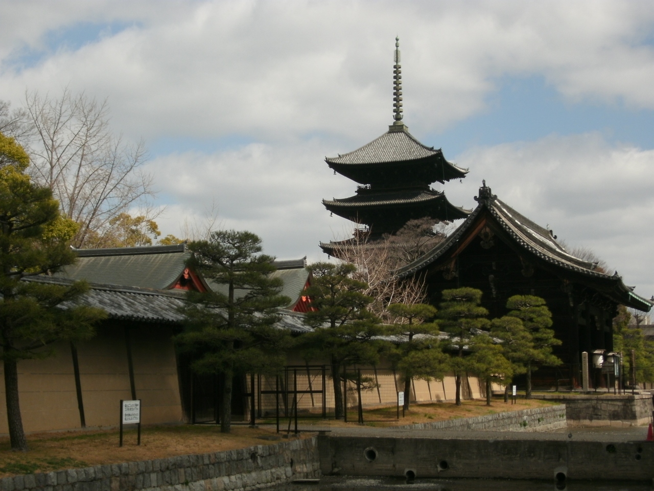 「東寺 (教王護国寺)」は、JR京都駅の南西1?ほどのところにあります。真言宗の根本道場であり、東寺真言宗の総本山でもあります。「教王護国寺」(きょうおうごこくじ)とも呼ばれる。山号は八幡山。本尊は薬師如来。東寺は平安京鎮護のための官寺として建立が始められた後、嵯峨天皇より空海(弘法大師)に下賜され、真言密教の根本道場として栄えた。中世以降の東寺は弘法大師に対する信仰の高まりとともに「お大師様の寺」として庶民の信仰を集めるようになり、今も京都の代表的な名所として存続しています。昭和9年(1934年)に国の史跡に指定、平成6年(1994年)12月には「古都京都の文化財」として世界遺産に登録されています。広大な境内には金堂や御影堂、五重塔、講堂、大師堂など多数の国宝や重要文化財の建物があります。中でも五重塔(国宝)は、東寺のみならず京都のシンボルとなっている塔で、高さ54.8メートルは木造塔としては日本一の高さを誇っています。天長3年(826年)空海により、創建着手にはじまるが、実際の創建は空海没後の9世紀末で、雷火や不審火で4回焼失しており、現在の塔は5代目で、寛永21年(1644年)、徳川家光の寄進で建てられたものです。