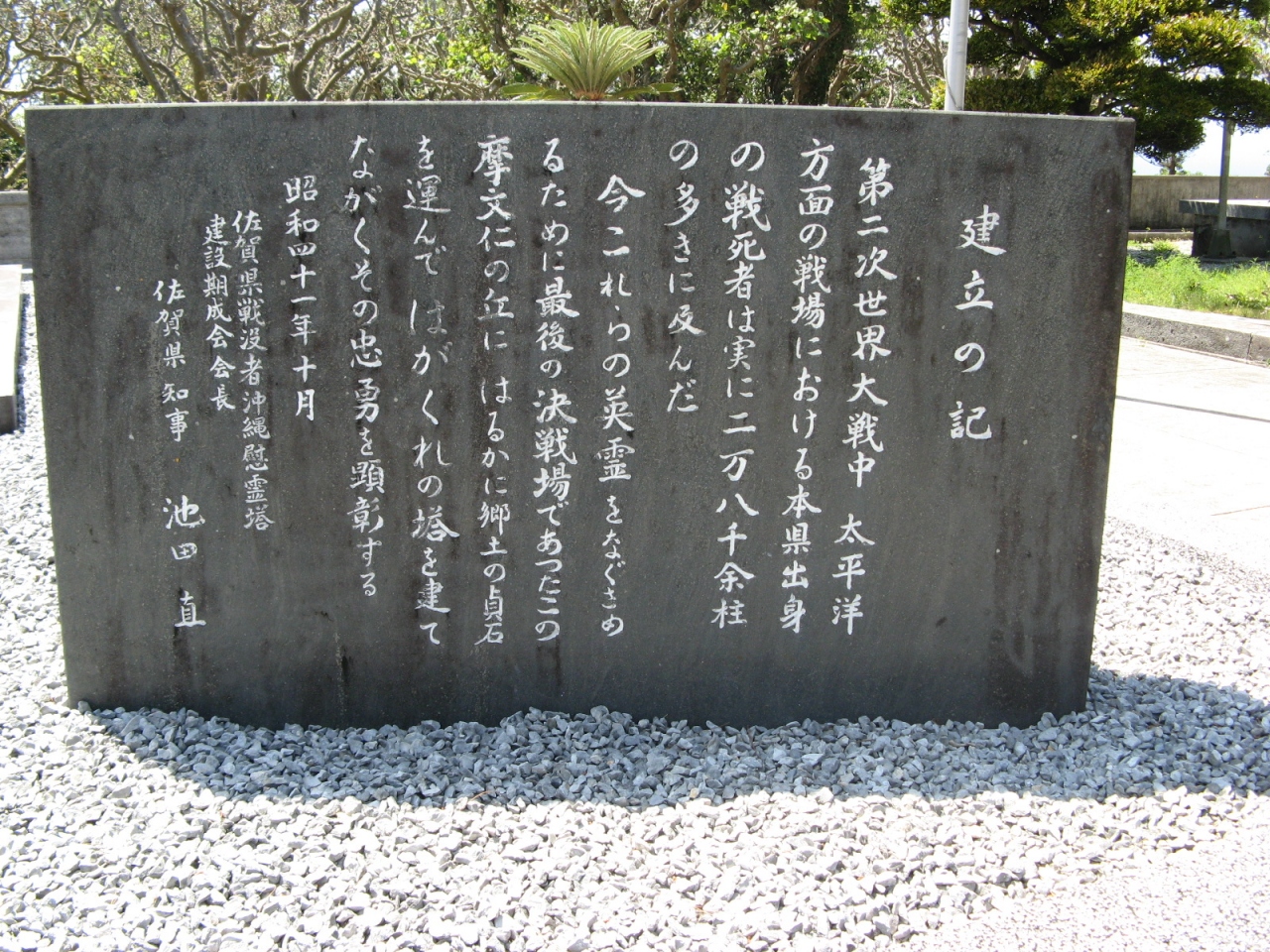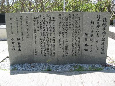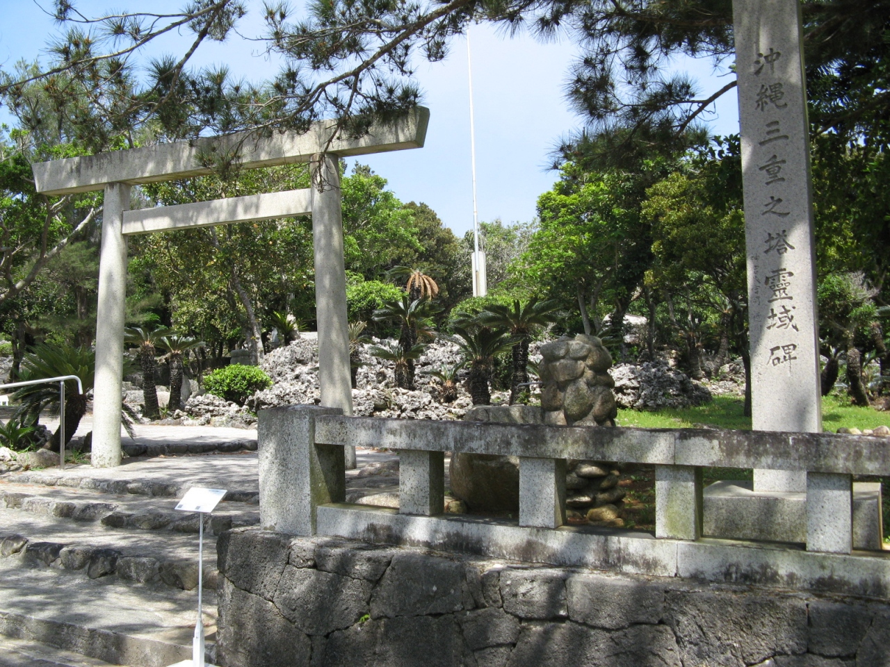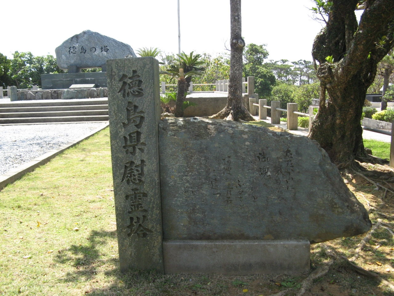 平和祈念公園の霊域ゾーンの中央辺りにあります。塔そのものは、そのほど大きくない御影石のあっとりとしたデザインですが、敷地の入り口にある鳥居をくぐって進むと石橋や山水庭園で構成され、全体的に神社風な造りになっています。碑文は、他県のものに比べるとちょっと勇ましい記述になっていますが、県民のご英霊に対する気持ちが伝わってきます。