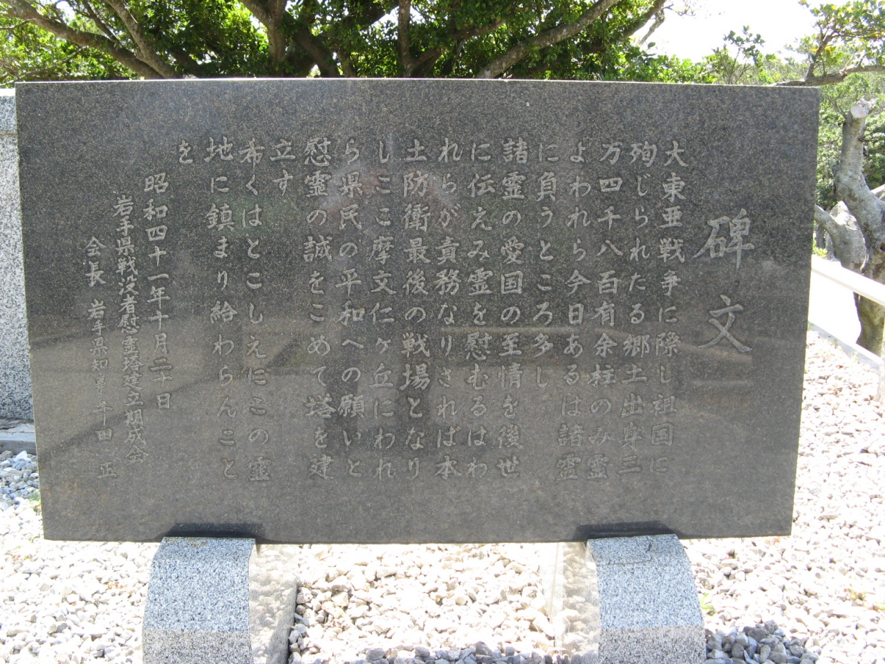 平和祈念公園の霊域ゾーンの中央辺りにあります。塔の形状は、岩手県の地形をデザインしたもので、県民性を表す「岩のようにどっしりした」県内産の自然石を使ったものとか。塔も碑文に刻まれた由緒もシンプルなものですが、県民性とご英霊に対する思いが伝わってくるものでした。