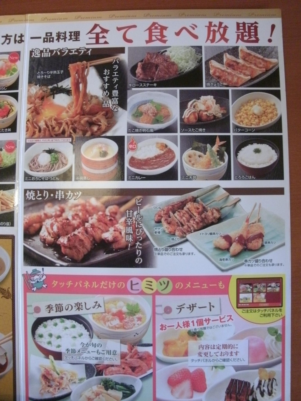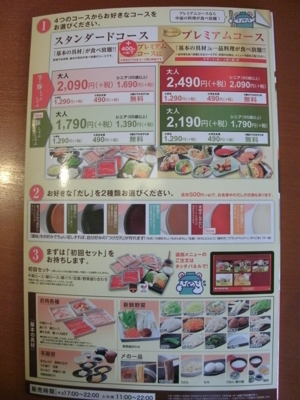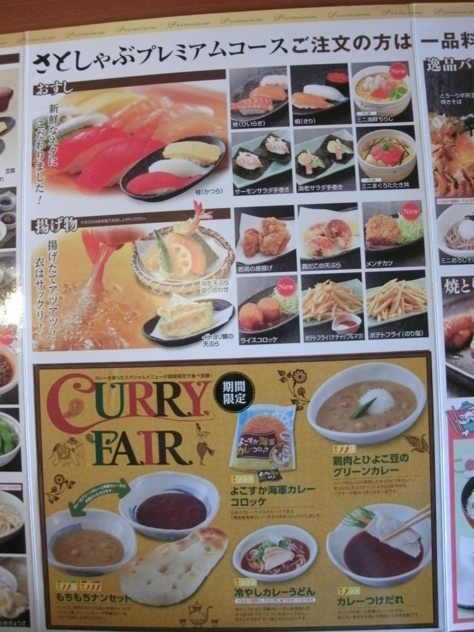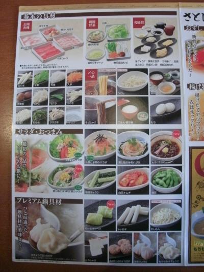 “さとしゃぶプレミアムコース(豚肉)2190円”を頂きました。豚肉のしゃぶしゃぶと、野菜や肉団子など鍋の具材のほか、サラダやお寿司、天婦羅、焼き鳥などの“一品”が食べ放題というシステム(2時間)です。デザートのオーダーは1個だけです。