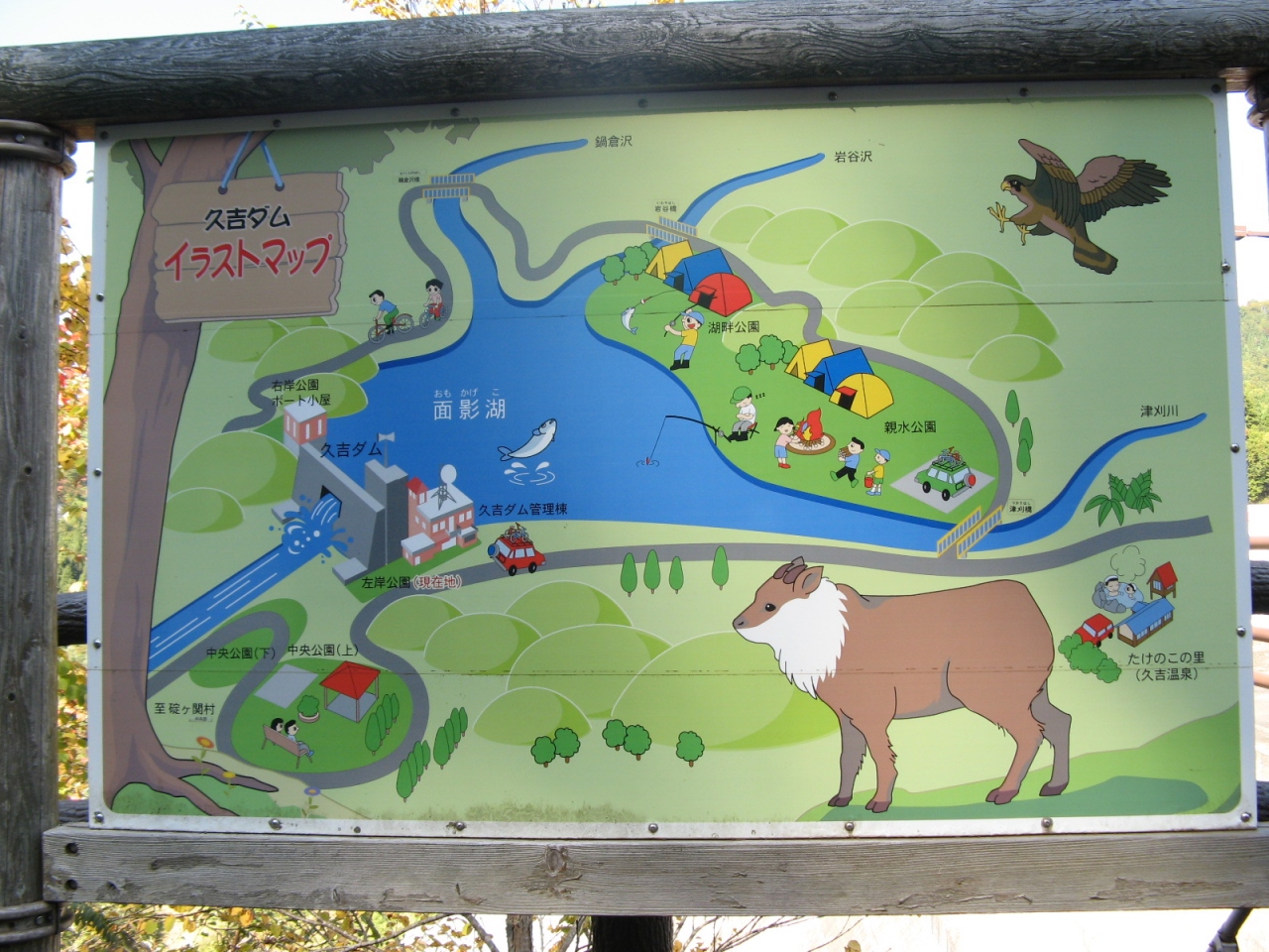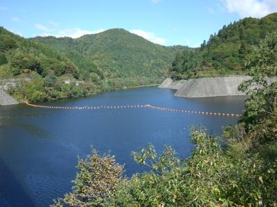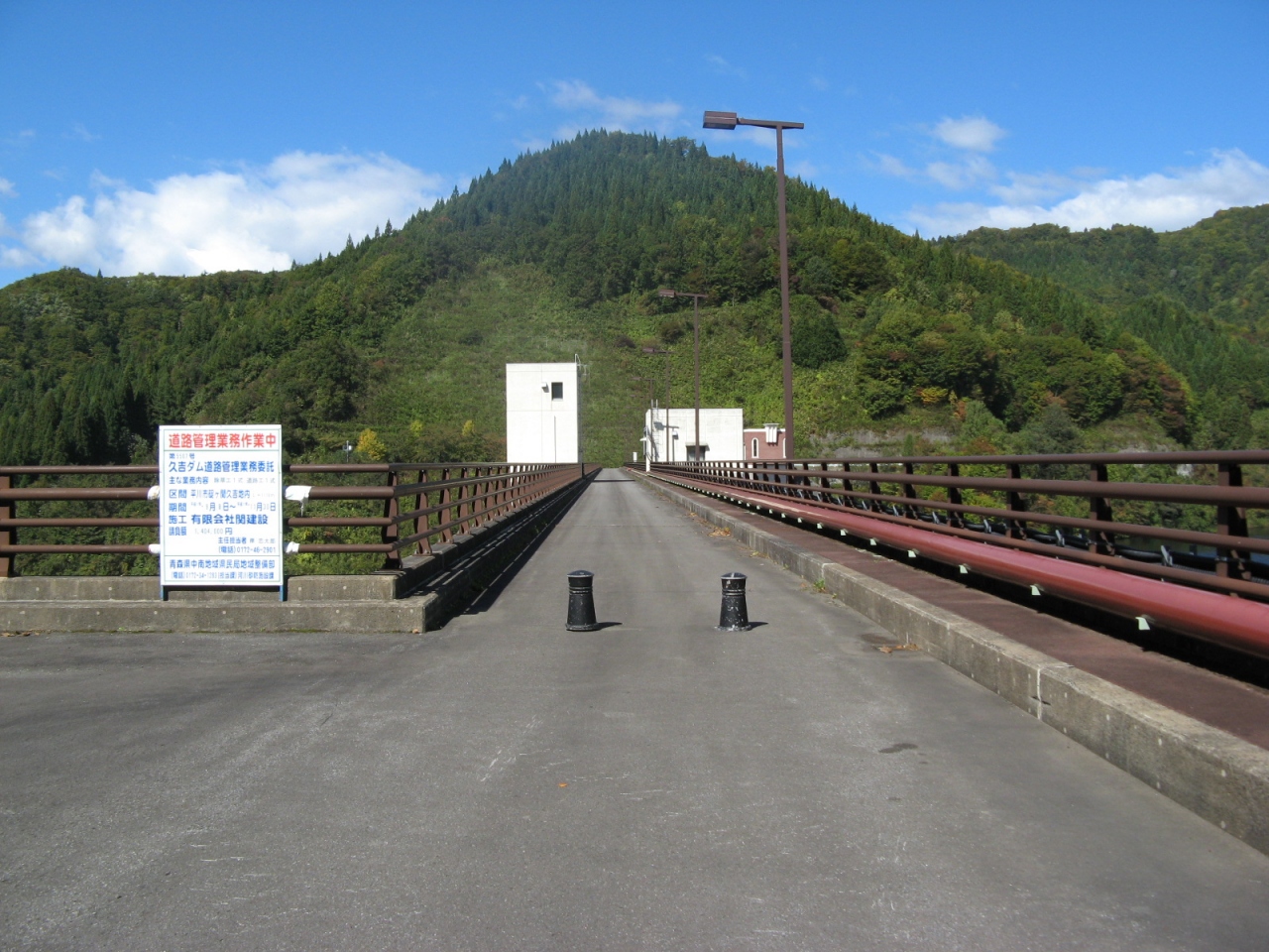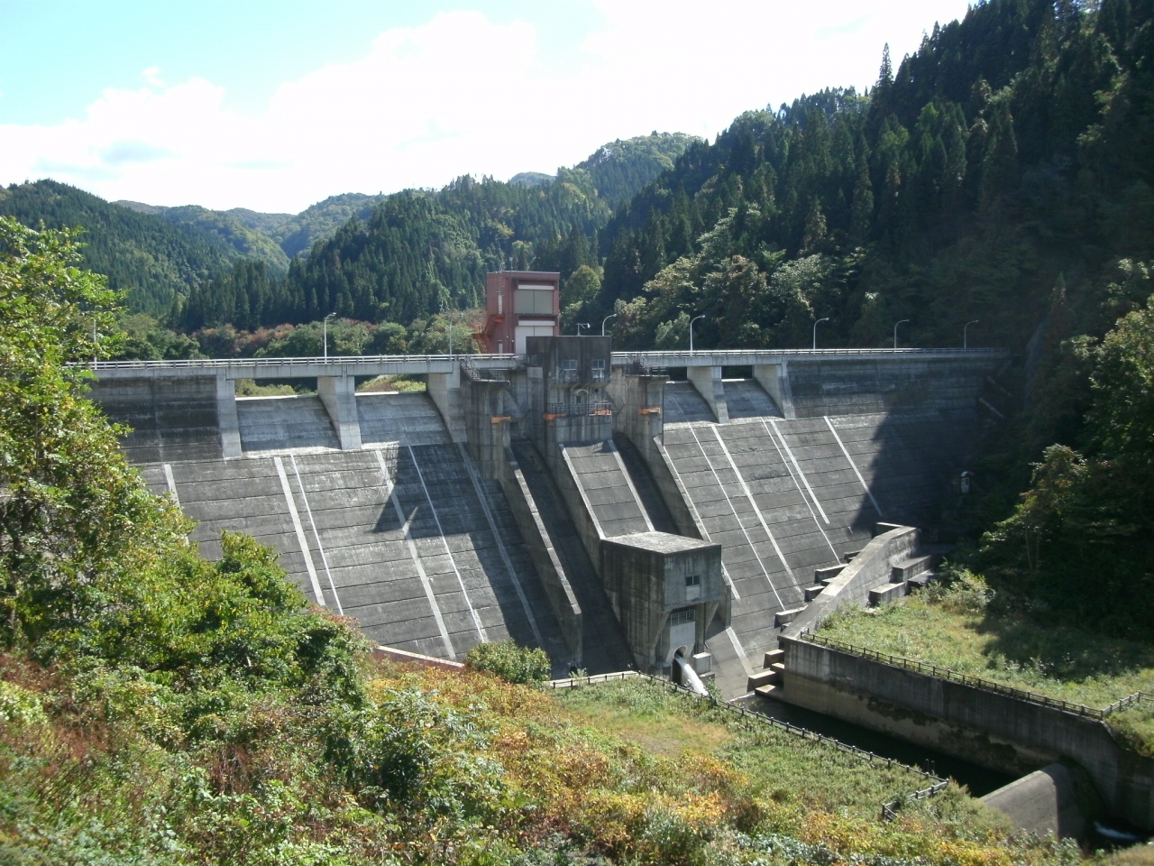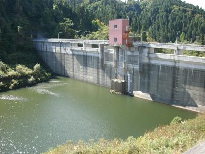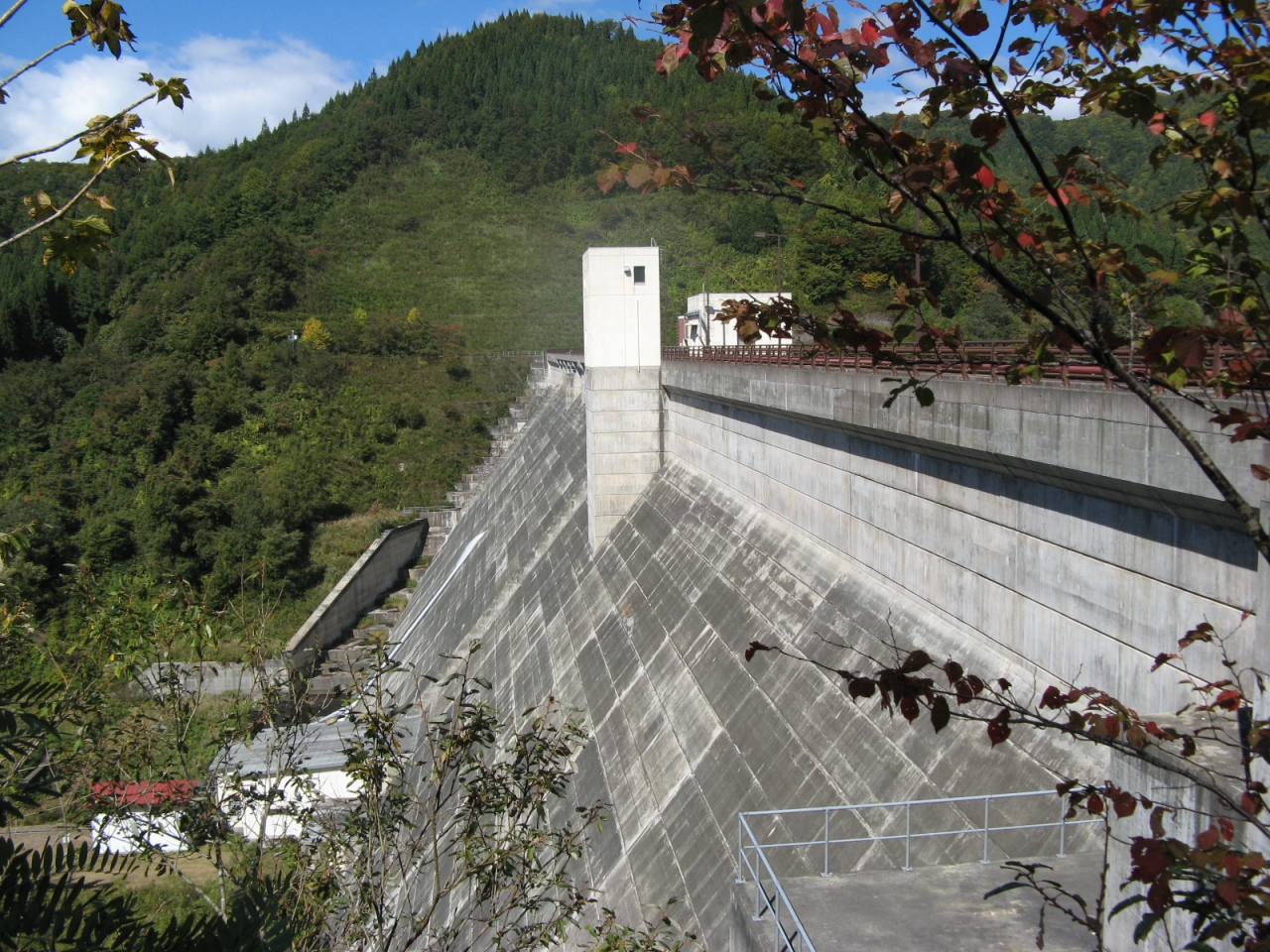 東北自動車道の“碇ヶ関IC”を降りて、車で10分余りのところにあります。洪水調節・灌漑・上水供給を目的とした堤高57m、堤頂長317mの重力式コンクリートダムです。ダムによって造られた湖は面影湖(おもかげこ)と名付けられています。ダムや湖の周辺は、親水公園や湖畔公園として整備されています。