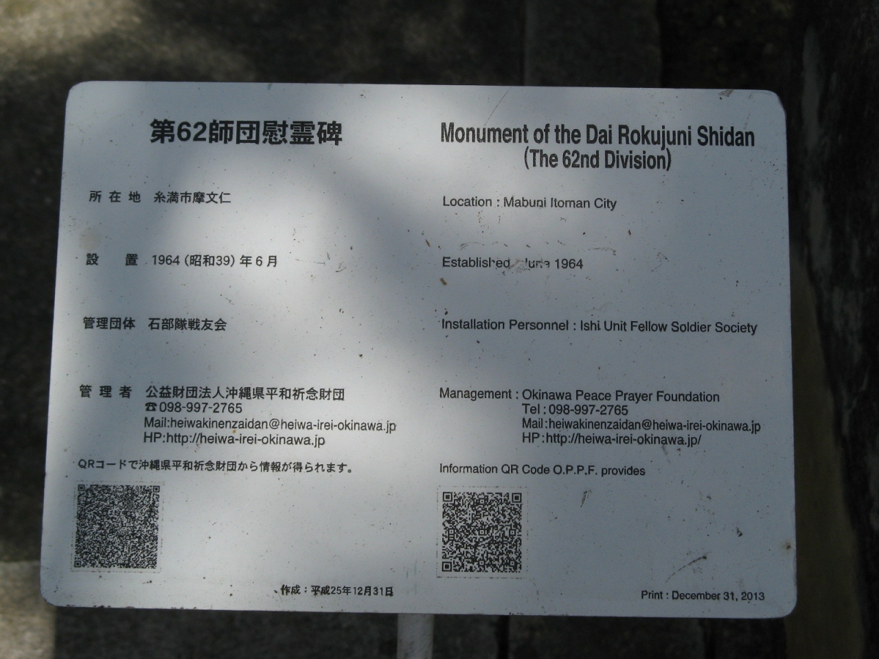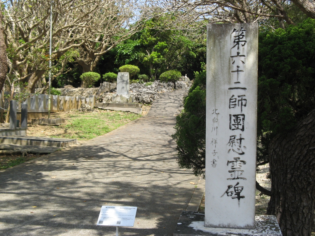 米軍と嘉数の戦いなど沖縄各地で激戦を続け、沖縄戦終結前、この地で師団がほとんど全滅状態となり、亡くなった第62師団の将兵の方々をお祀りされています。