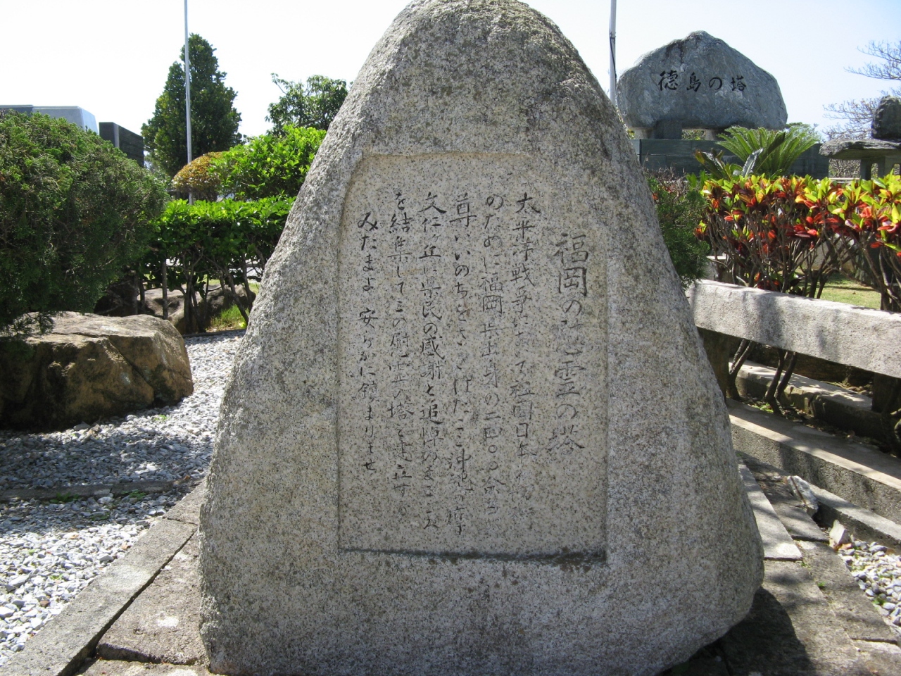 塔は徳島県産出の青石を使ったシンプルなもので、その周りを県下各市町村名の入った飾り石が囲んでいます。碑文には、『たたかひに 散りたる御魂 やすかれと ふるさと 阿波の青石を建つ』と刻まれています。