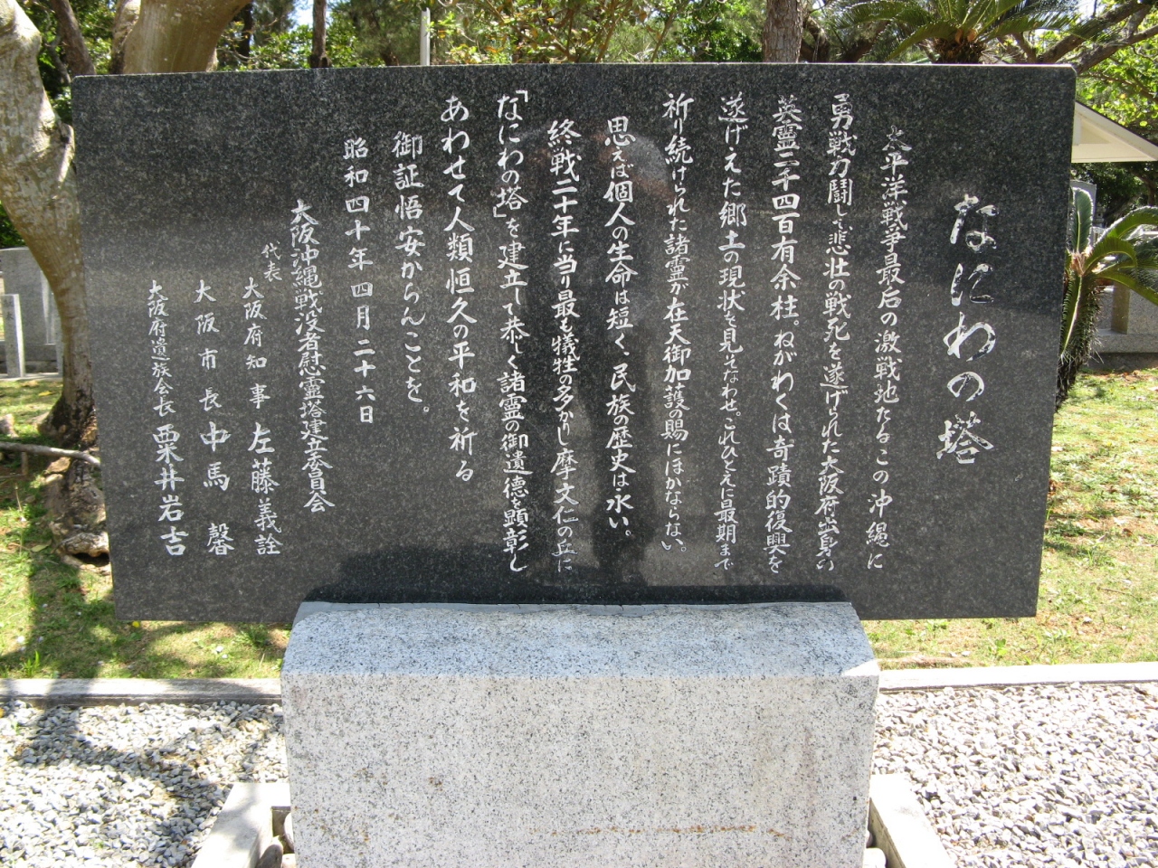 『祖国防衛の御楯として 南方諸地域に散華したまいし 英霊3万5千有余柱を この摩文仁の丘なる わが「なにわの塔」に 恭々しく斎祀し奉る アジアではじめての万国博覧会が 諸霊の郷土で開かるるにあたり 願わくば 三世通達の智眼を開いて とこしえに「人類の進歩と調和」を 守護したまわんことを』
