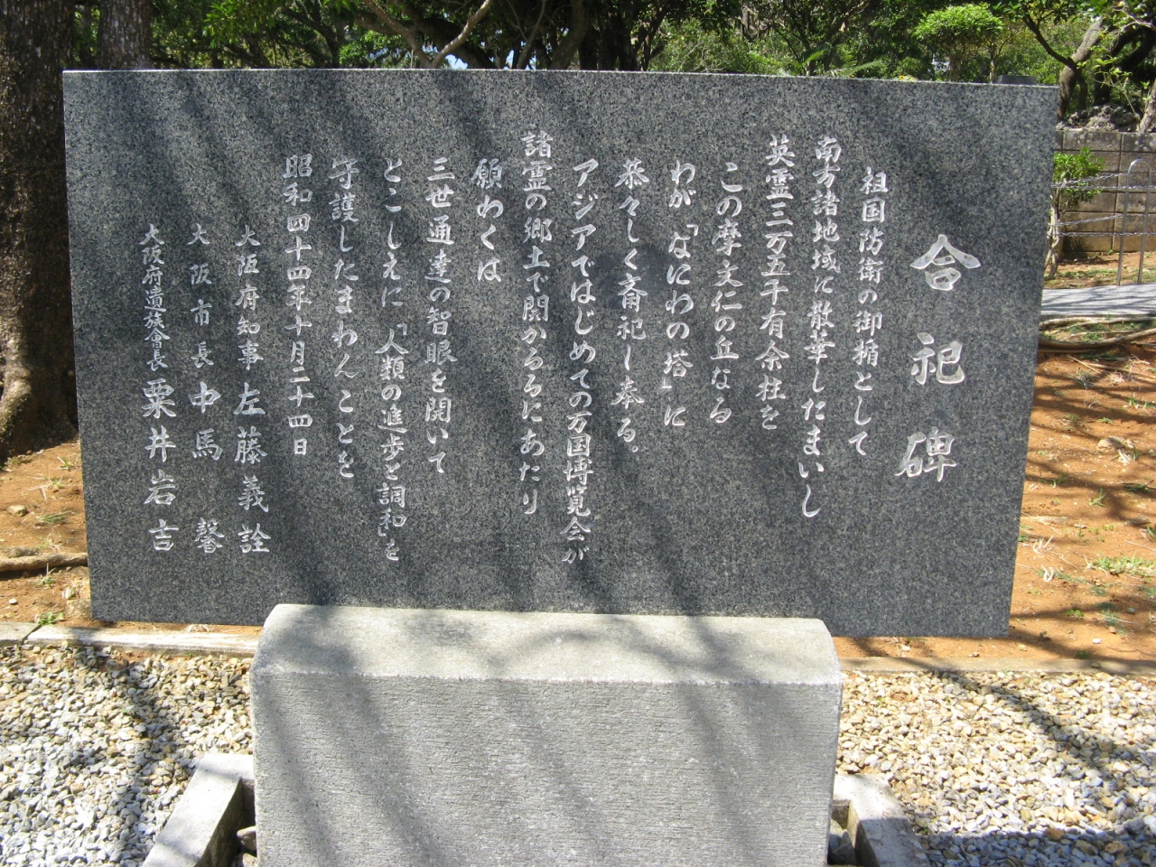 昭和40年、終戦20周年記念事業の一つとして沖縄戦において散華された大阪府関係戦没者を追悼するために建立された後、昭和44年に南方諸地域戦没者を新たに合祀したそうです。昭和44年と言えば、大阪万博が開催された年で、戦後20年あまり、アジアではじめての万国博覧会を開催するまでになったということを英霊に報告する意味もあったのでしょうか、その思いが“合祀碑”に記載されています。