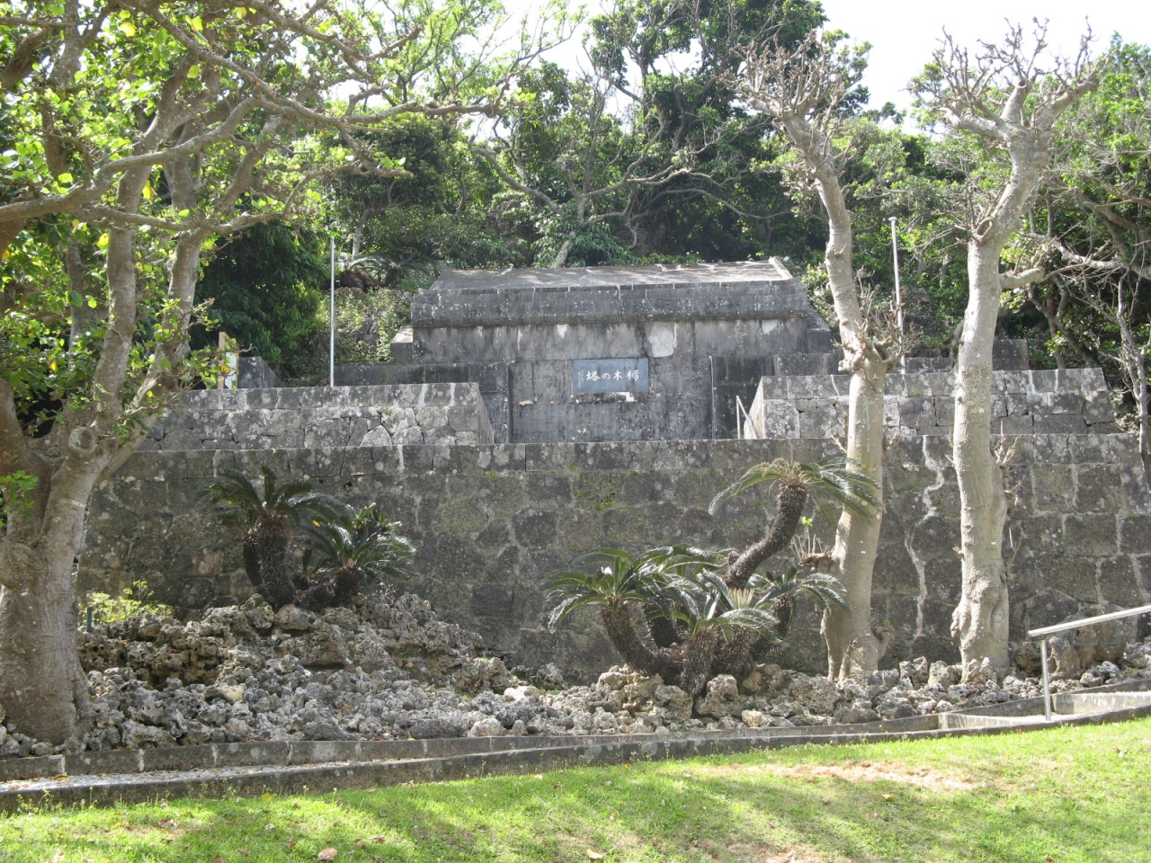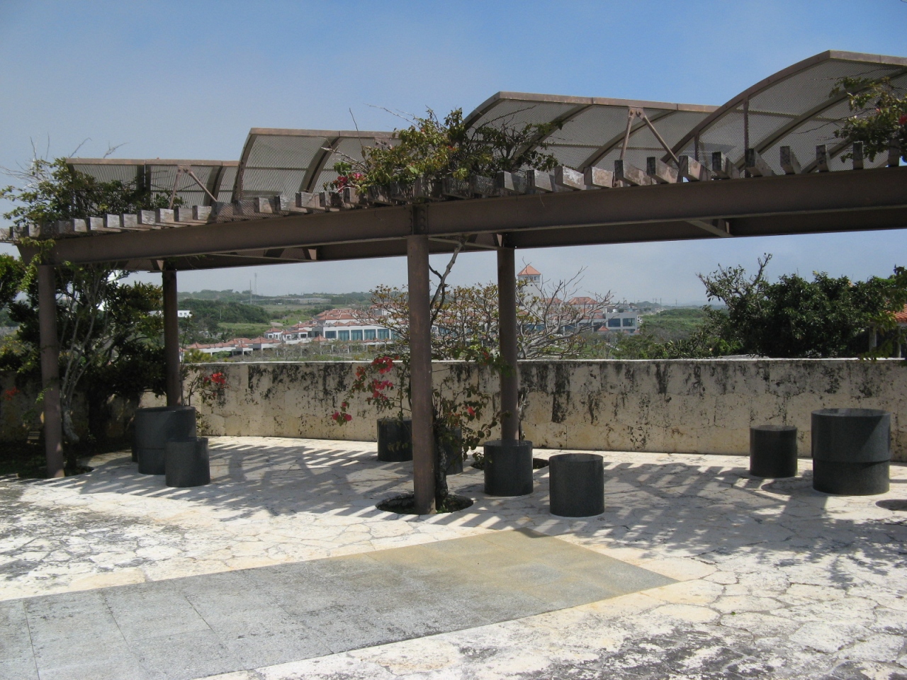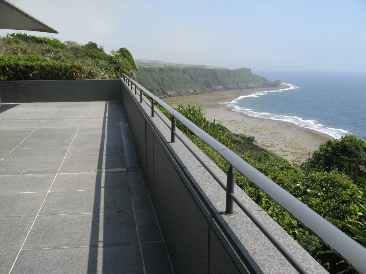敷地内には休憩所が設けられていて、南方の海が彼方まで見渡せます。綺麗な景色ですが、ここから見る海は、本島西海岸の華やかな海と違って少し寂しげに見えます。- 旅行時期